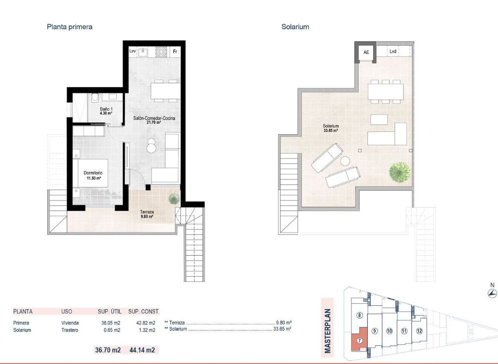 We think this offers great value for money and there is also a ground floor available with large terrace. On entering this apartment you will find the lounge diner which has patio doors to the 10m2 terrace. The kitchen is open plan and modern. There is a good sized double bedroom with fitted wardrobes and patio doors to the terrace and also a family bathroom. External stairs lead to the 34m2 roof solarium which has storage area that houses the aerothermal boiler and preinstallation for washing machine. This is a small development of 14 apartments and they have a communal pool with waterfall and bike storage. There is preinstallation for gas and ac.