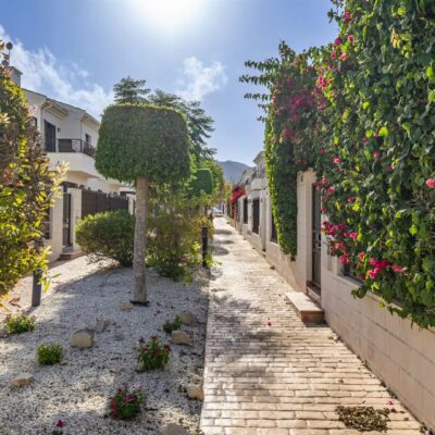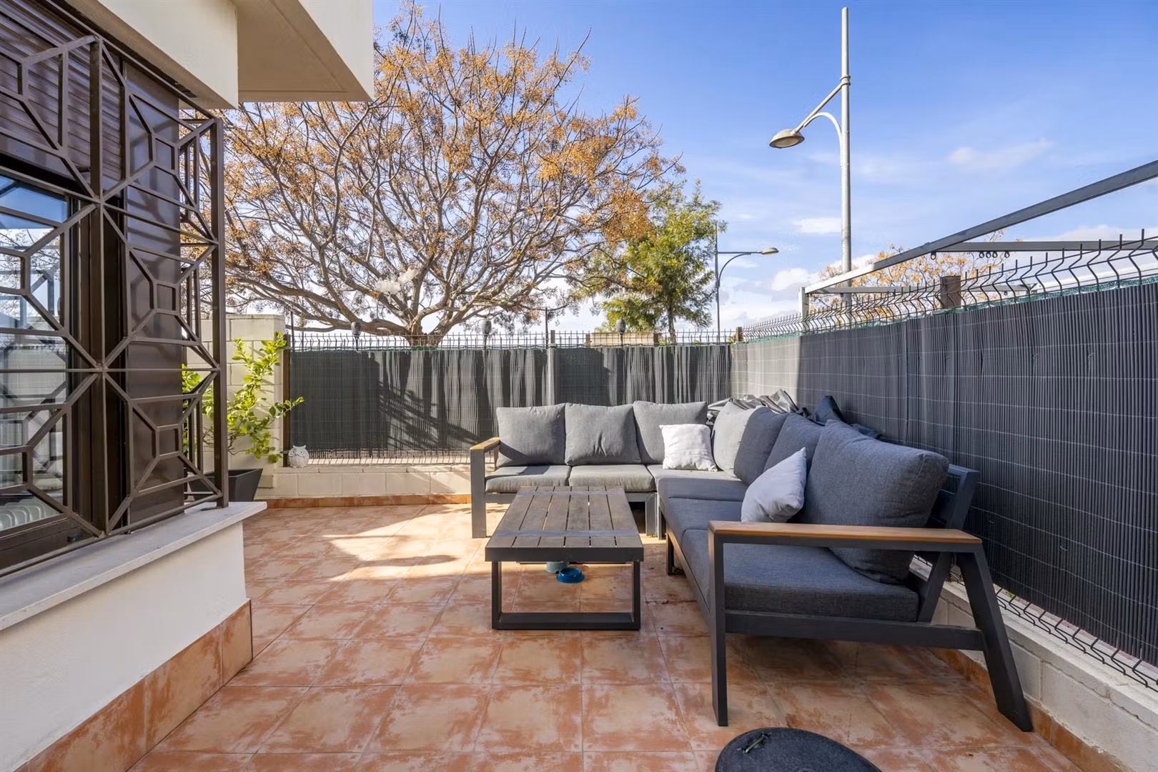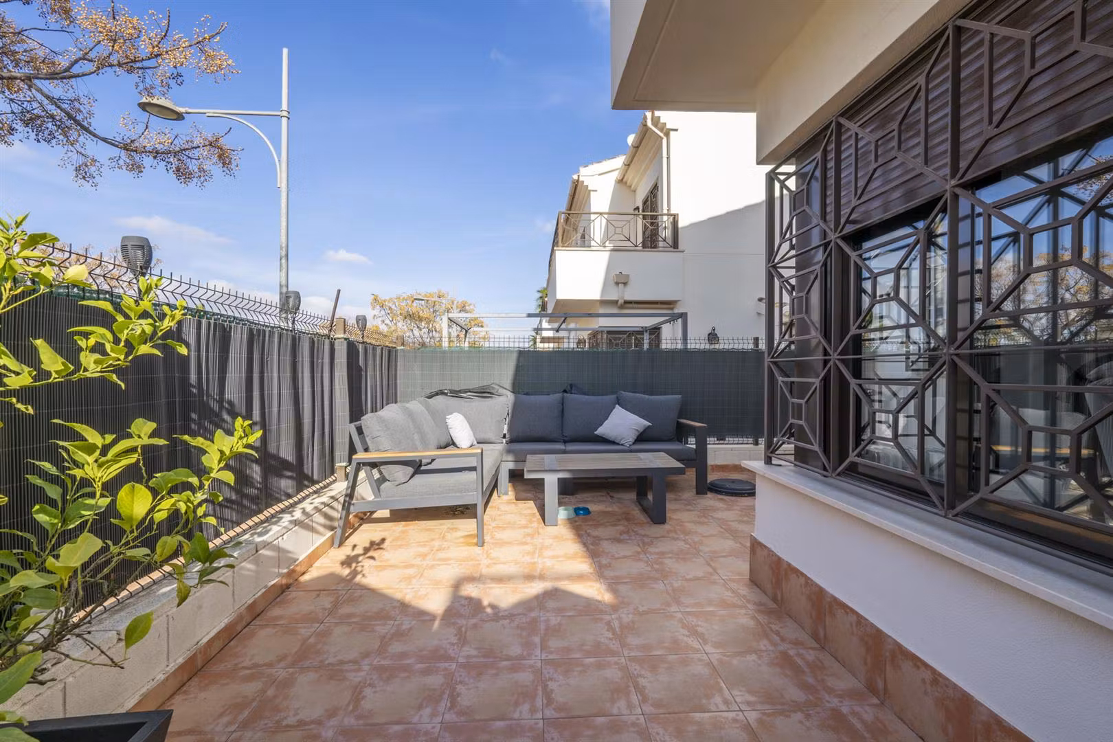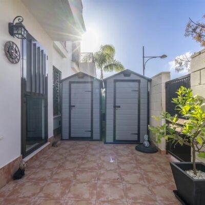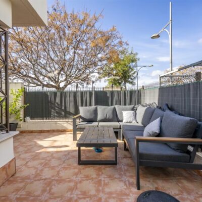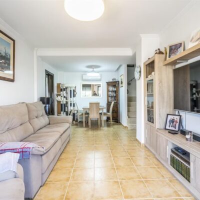 Downstairs there is a spacious living dining area with access through patio doors to the west facing garden, fully fitted upgraded kitchen and plenty of storage spaces, a double bedroom and a WC. Upstairs are two further bedrooms, one of which has its own ensuite andthere is also a family bathroom. All the bathrooms have also been upgraded. The bedrooms have wardrobes and one of the upstairs bedrooms has access to a terrace to enjoy a morning coffee which overlooks a pretty park area. The property comes part furnished, , airconditioning hot and cold and benefits from solar panels.