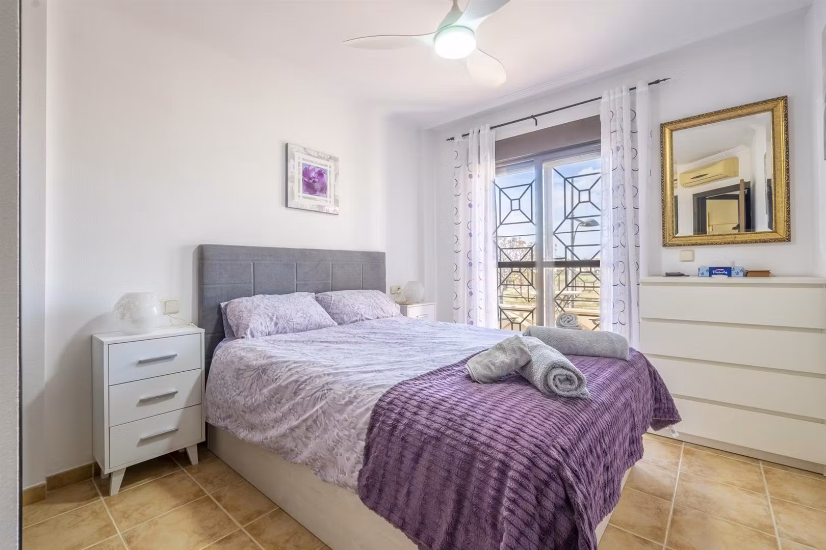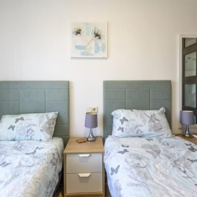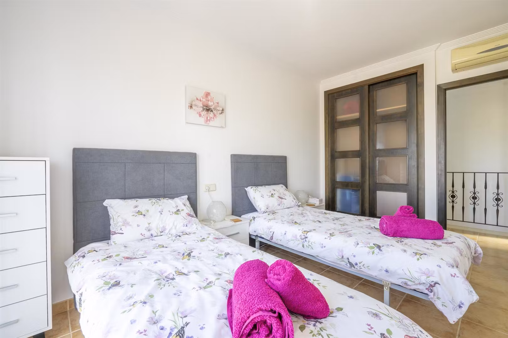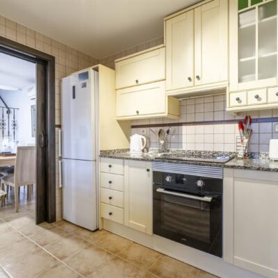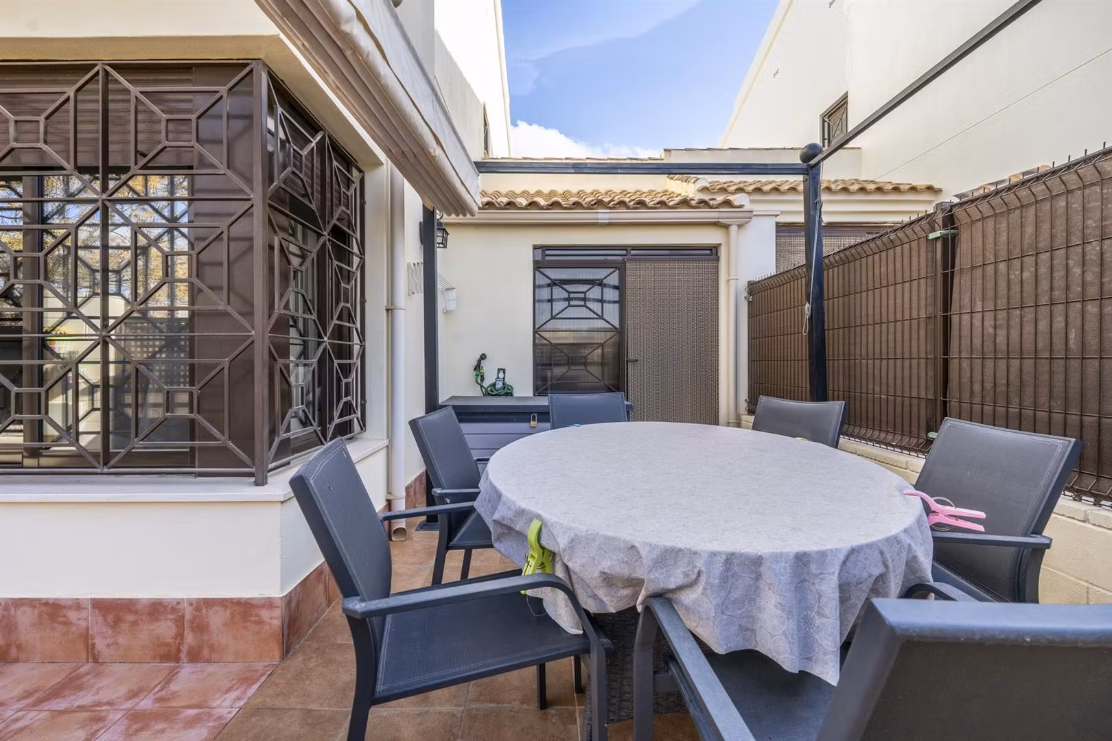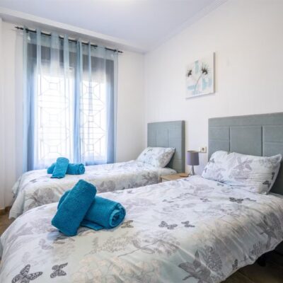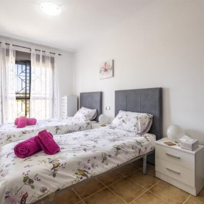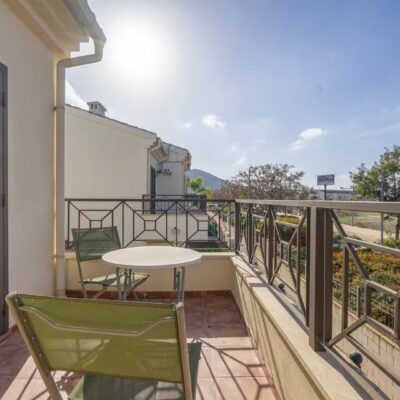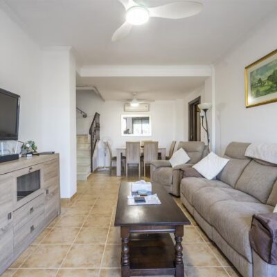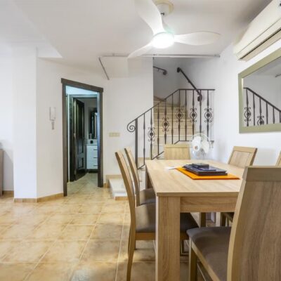 Downstairs there is a spacious living dining area with access through patio doors to the west facing garden, fully fitted kitchen and plenty of storage spaces, a double bedroom and a WC. Upstairs are two further bedrooms and a family bathroom. The bedrooms have wardrobes and one of the upstairs bedrooms has access to a terrace to enjoy a morning coffee which overlooks a pretty park area. The property comes furnished and airconditioning hot and cold