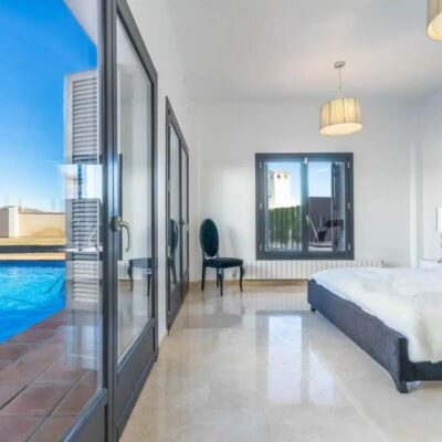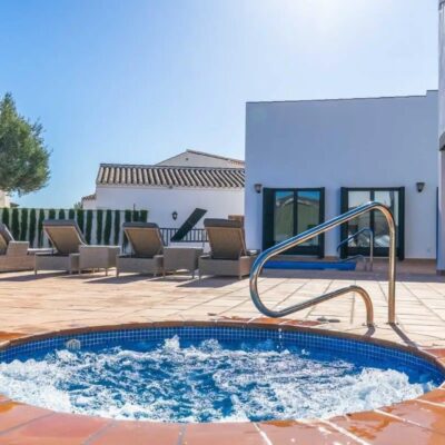 This style of villa is the largest on El Valle Golf Resort and bathed in light due to all the windows and patio doors it has. On entering the property you really appreciate the space it has to offer with a huge dining living area, the living area has high vaulted ceiling and a woodburning fireplace. From here you can choose one of the many patio doors to go out to the vast garden which has a large private pool, separate jacuzzi pool and a covered terrace and large lawned area. up some external stairs and you will find a roof solarium with views across the mountains and countryside. The kitchen is a great size and it has a garage and driveway parking. There are 4 double bedrooms with fitted wardrobes and three bathrooms and the master suite has a walk in wardrobe and ensuite bathroom. It comes furnished with vented AC.