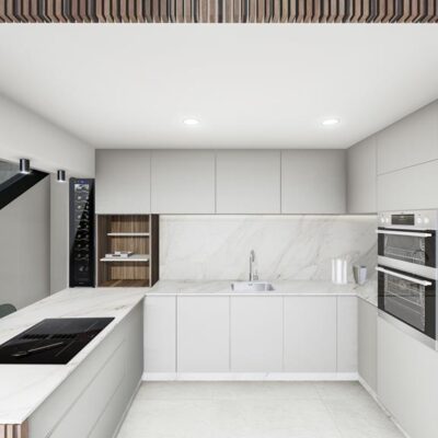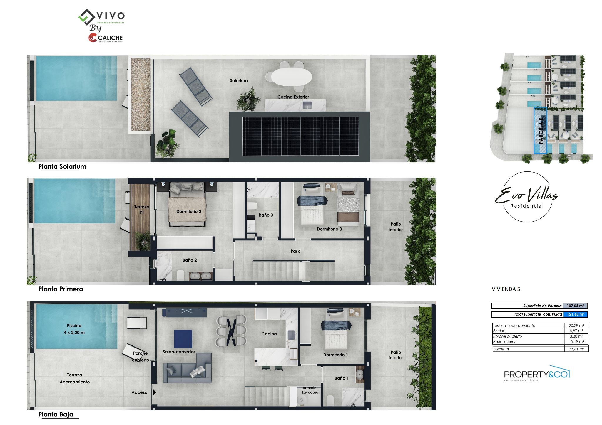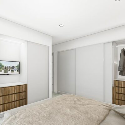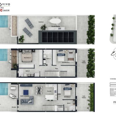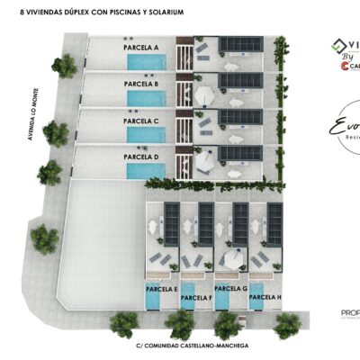 These villas have a good sized garden with private pool and space to park your car. On entering the property you will find the open plan lounge kitchen diner which has patio doors to the garden. There is a downstairs bedroom with fitted wardrobes and patio doors to the rear patio courtyard, a downstairs bathroom and a separate utility room for the aerothermal 100L boiler and washing machine. Upstairs there are two further double bedrooms with fitted wardrobes, a family bathroom and the master bedroom has its own ensuite bathroom and patio doors to another terrace. Up a further flight of stairs is the roof solarium that has a summer kitchen and 6 solar panels. These properties come with white goods except the washing machine, LED lights, preinstallation of vented AC and a home automaton system that controls the motorized blinds, the pool filtration system, outdoor lights and climate control.