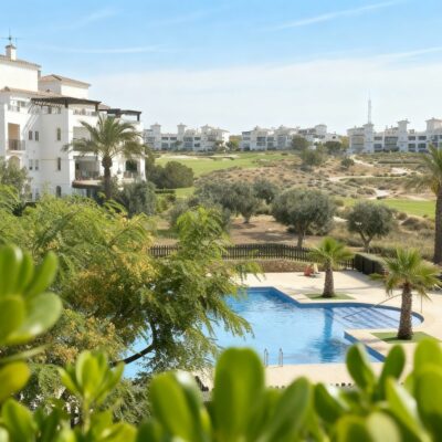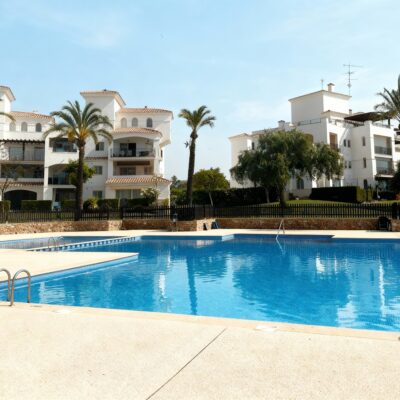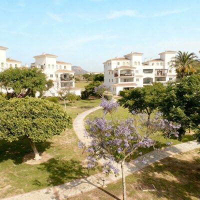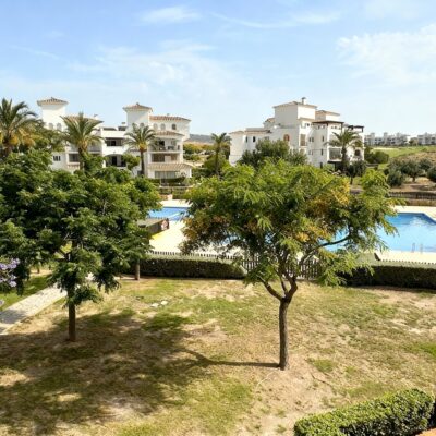 We are thrilled to offer this rare two bedroom two bathroom end apartment on the stunning Hacienda Riquelme Golf Resort.  The property is in a prime location, close to the El Cason clubhouse and supermarket.  It is being sold furnished, with aircon in the lounge, gas central heating throughout, lift and stair access and allocated underground parking.  The village of Sucina is a 5 minutes drive which offers an array of bars, restaurants and amenities. There is a bike path which would take 15 minutes to get to Sucina.