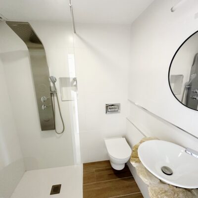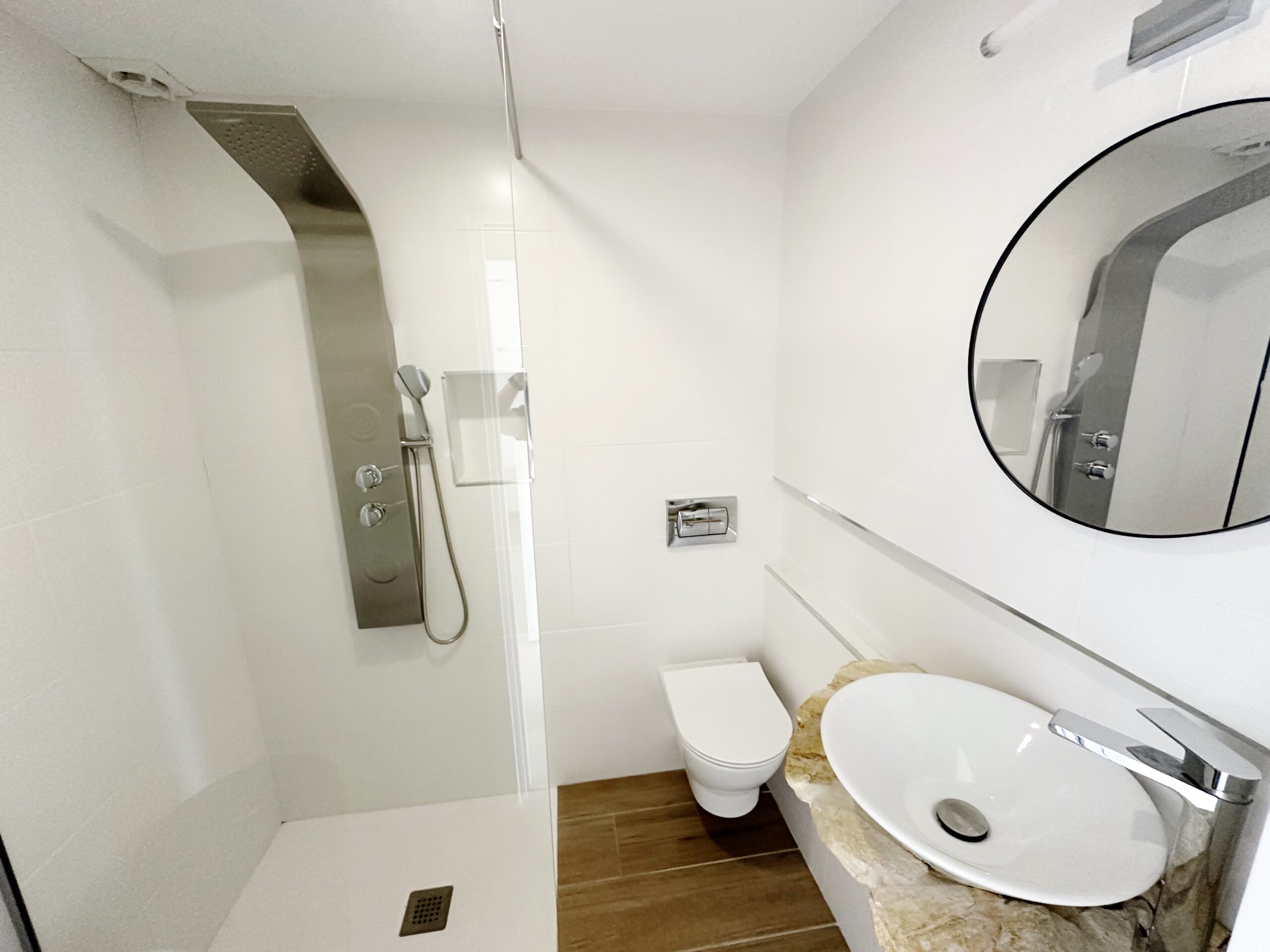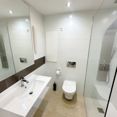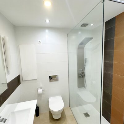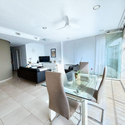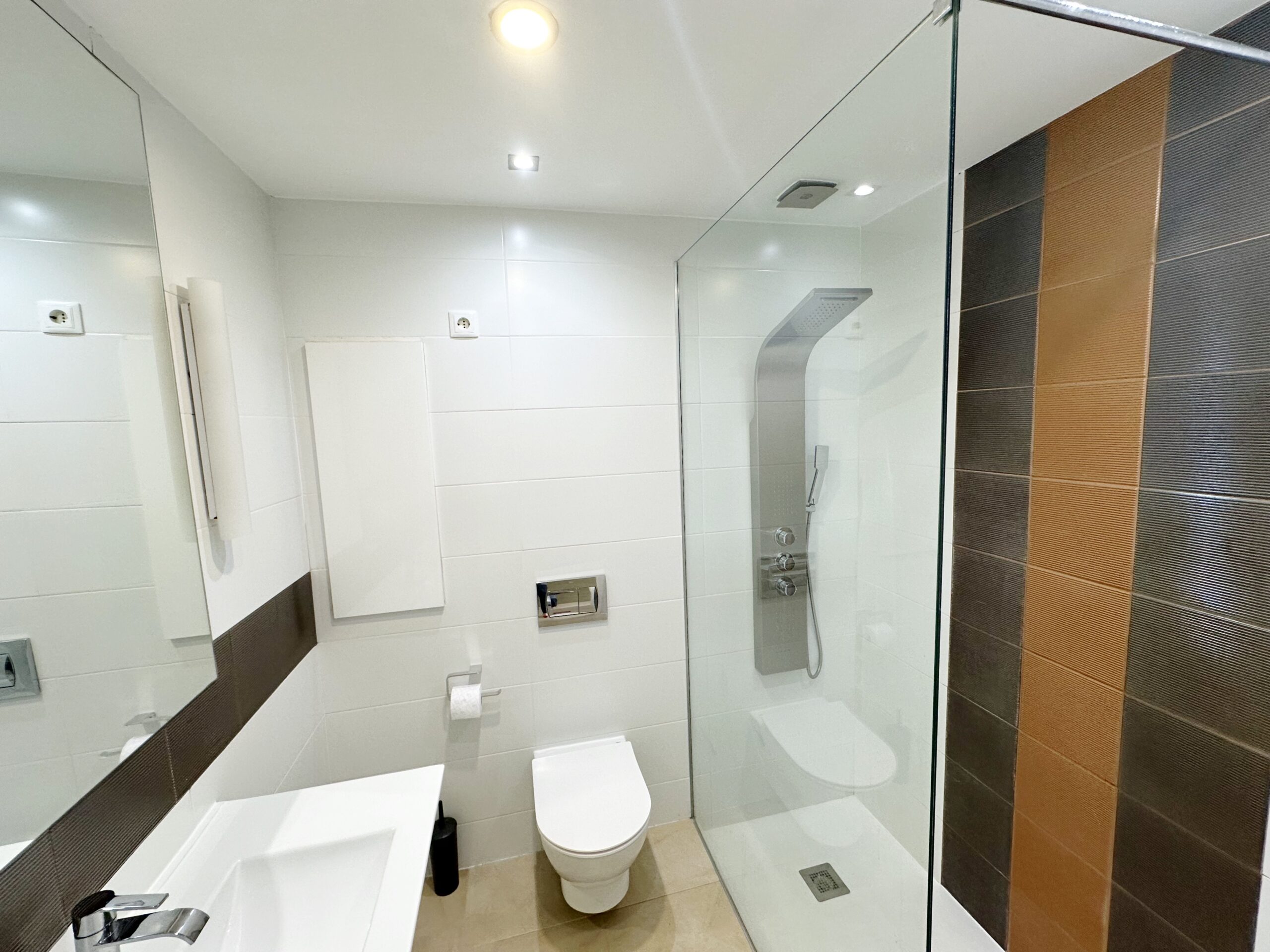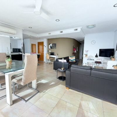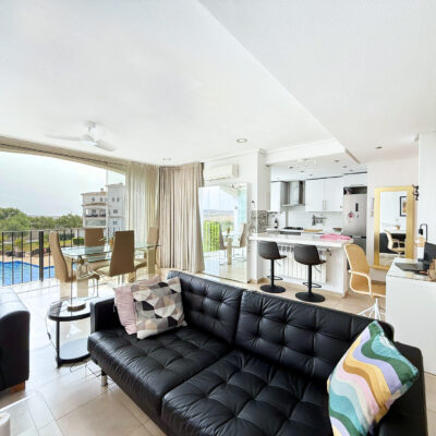In brief, the property comprises a spacious living area with folding glass curtains and views across the pool area. The open-plan kitchen has been updated to create a superb living space. The master bedroom has a ceiling fan and sliding doors making it bright and airy. There is a second double bedroom and there are two re-fitted shower rooms. The apartment benefits from a rear West facing terrace and secure parking in the underground garage which has a lift to all floors).