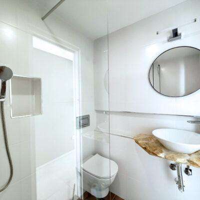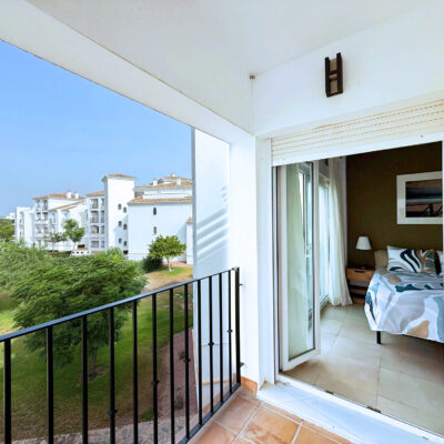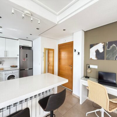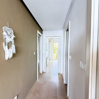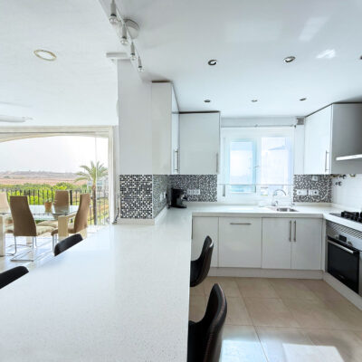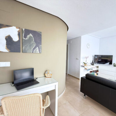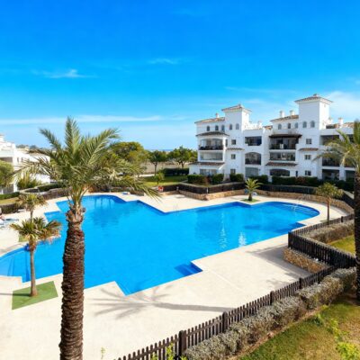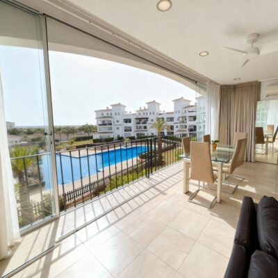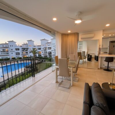 An exceptional opportunity to buy an extended and modified second floor apartment on the popular Hacienda Riquelme Golf Resort. The apartment was originally the desirable ‘curved wall’ design which has been further improved by extending the living space into the terrace, making the kitchen open-plan and adding an additional shower room.