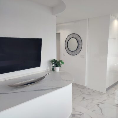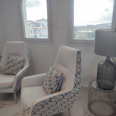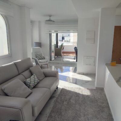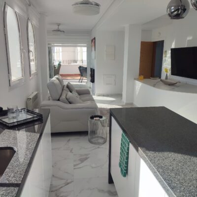 This penthouse apartment has been made open plan and now has a gorgeous modern kitchen with island. The terrace faces South so gets sun all day and benefits from far reaching views down across the golf course. There are two double bedrooms and a bathroom, along with a parking space in the secure underground garage which has a lift to all floors.