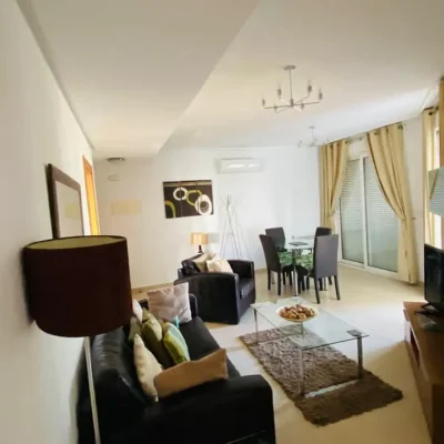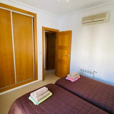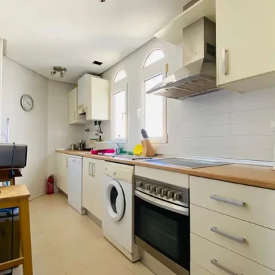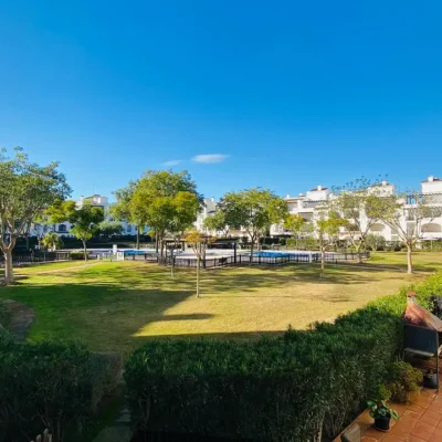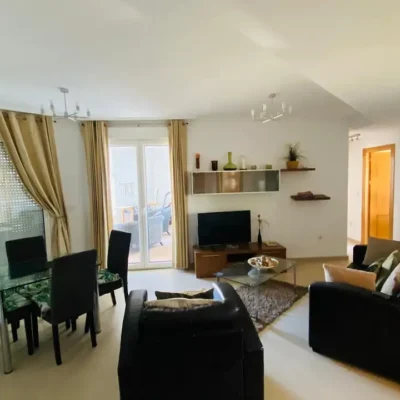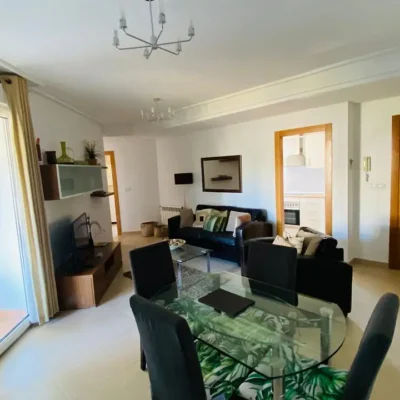 This apartment is being offered for sale furnished and with air-conditioning throughout. There is a living room, fitted kitchen, covered terrace with views across the garden area and swimming pool, two double bedrooms and a family bathroom. The apartment comes with a parking space in the secure underground garage which has a lift to all floors. Contact us to arrange a viewing.