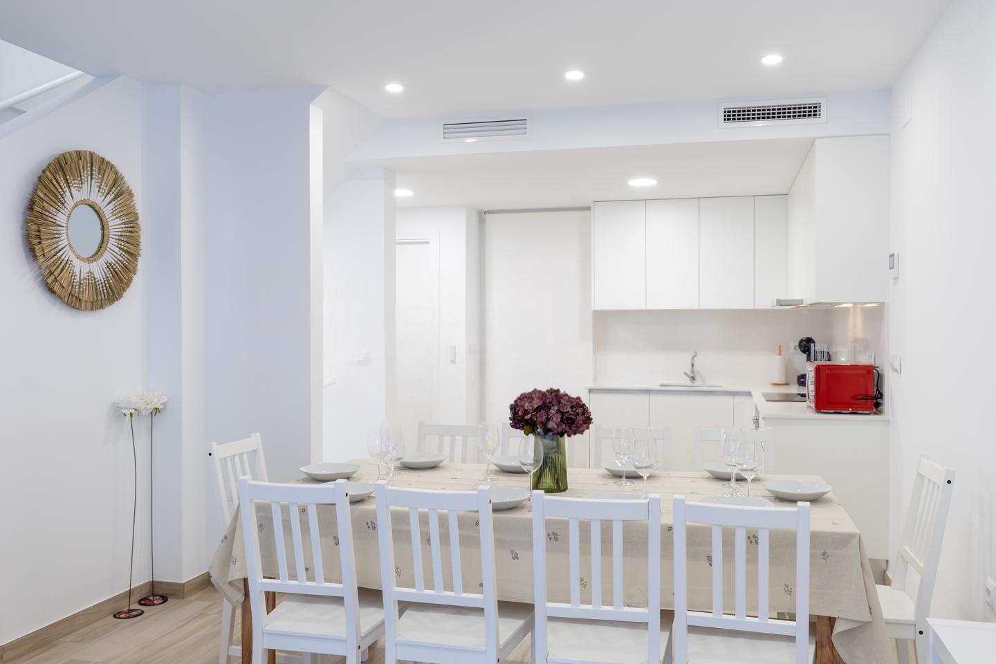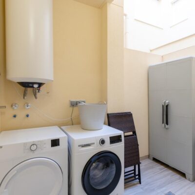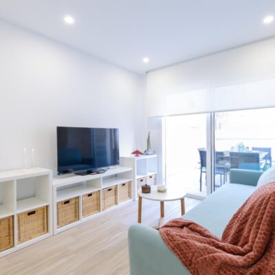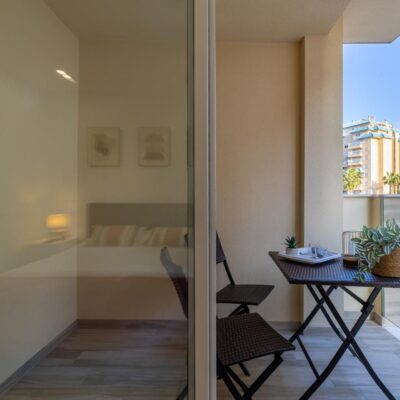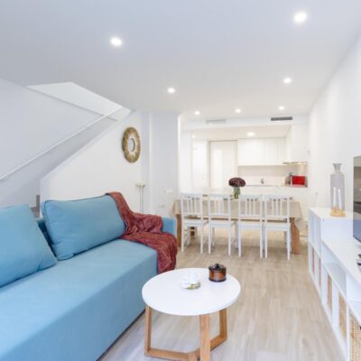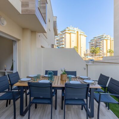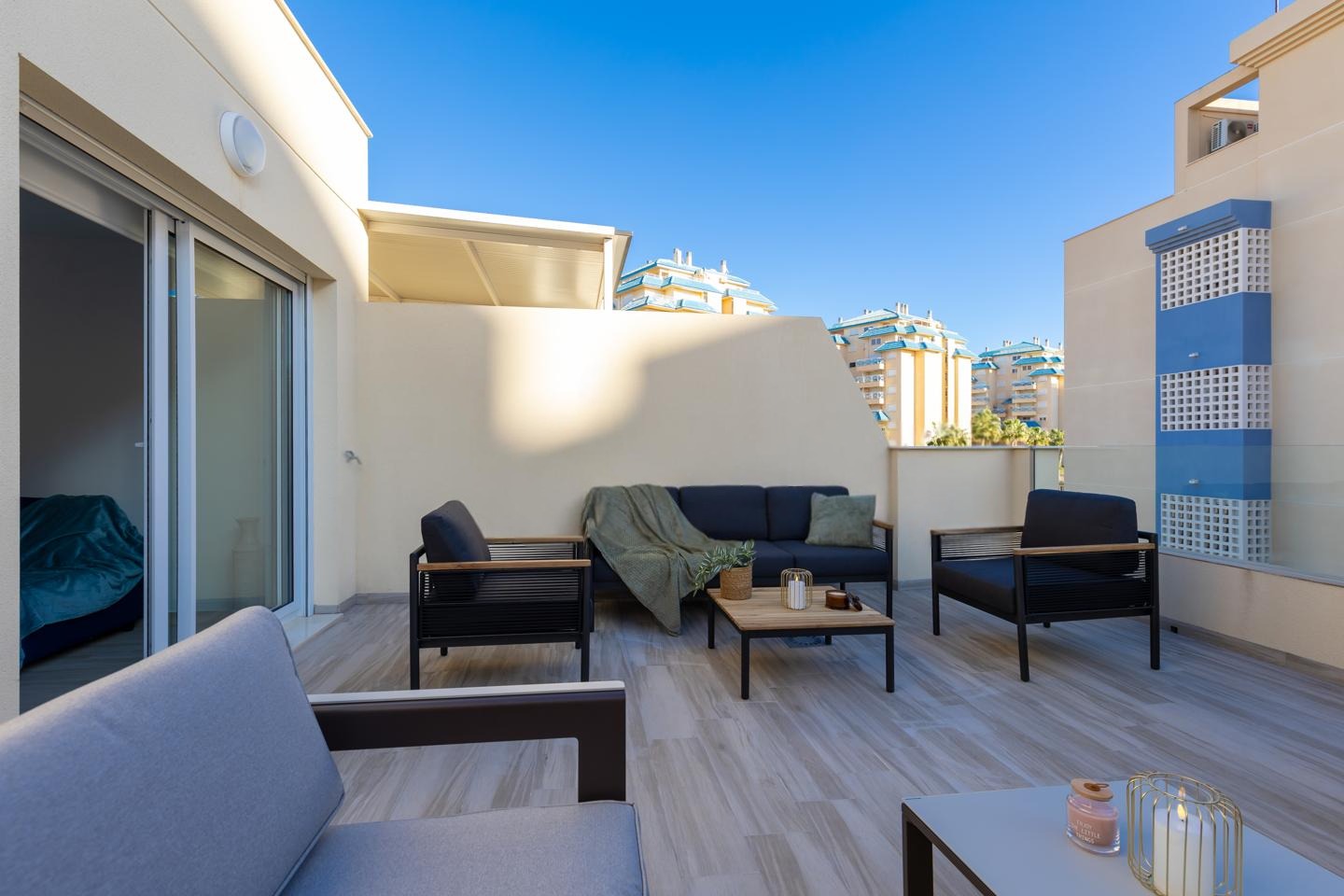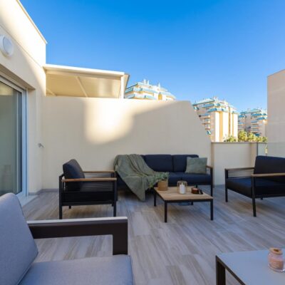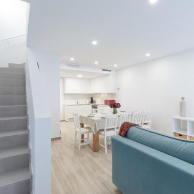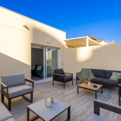 It also includes two full bathrooms, modern and fully equipped, finished with practical and tasteful materials, ideal for everyday holiday use. The living area is warm and inviting, with a generous lounge filled with natural light, perfect for relaxing after a day at the beach. The fully equipped kitchen is designed to meet all the needs of a holiday stay. There is a good sized terrace on the ground floor and an internal courtyard, upstairs there is a little terrace off one of the bedrooms and on the next floor there are two terraces. The property comes with underground parking.