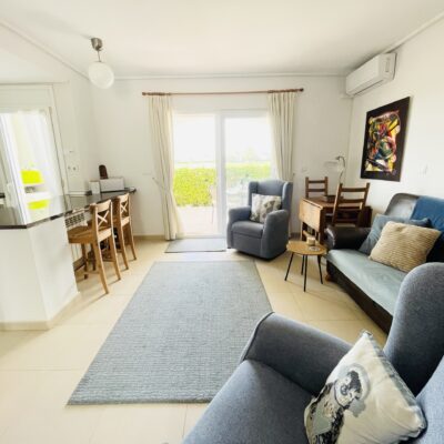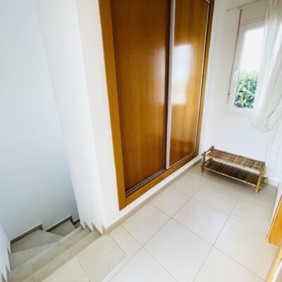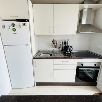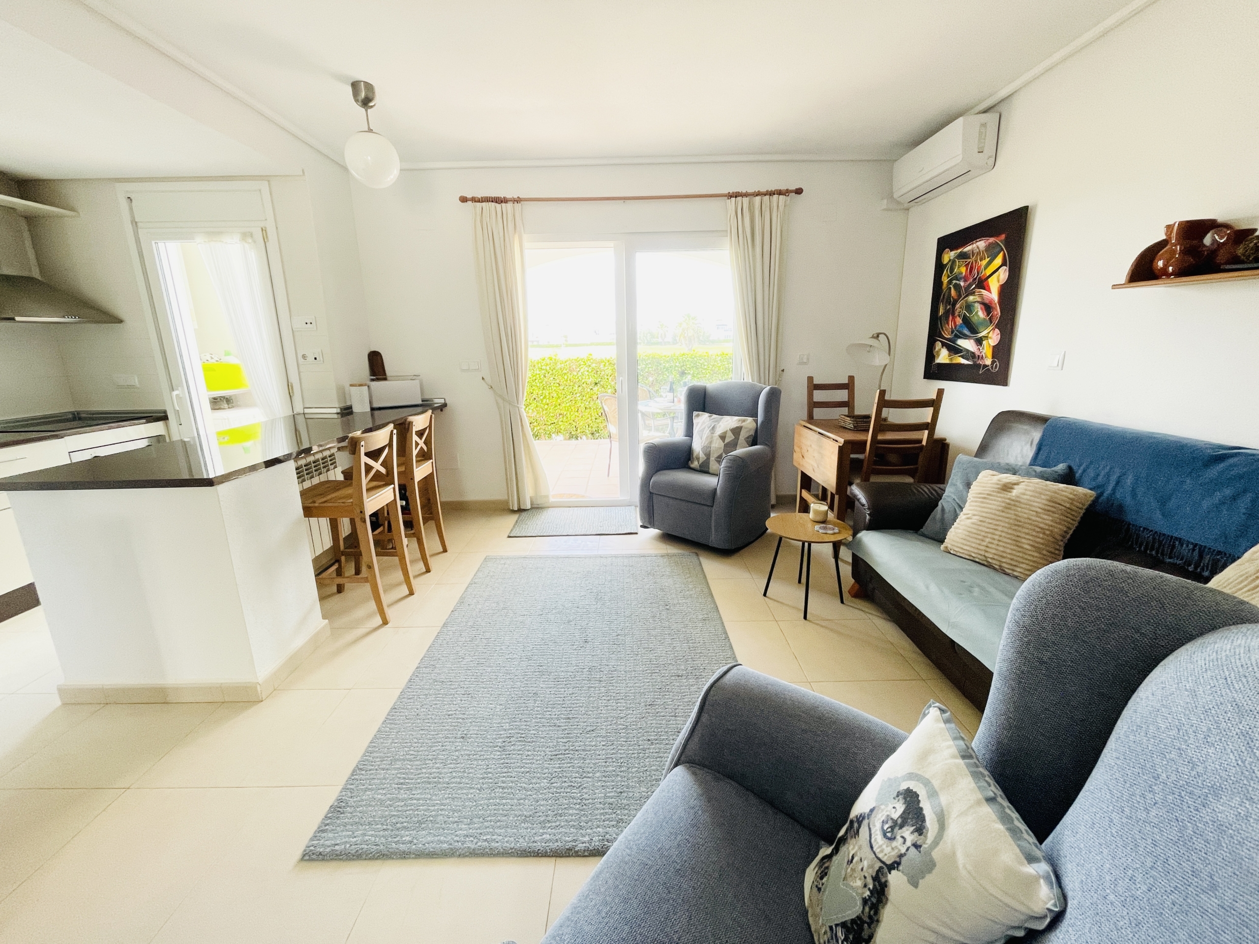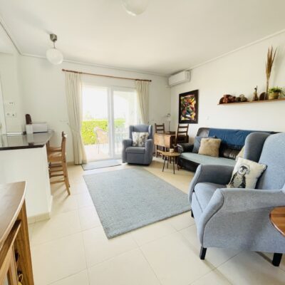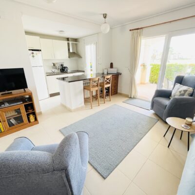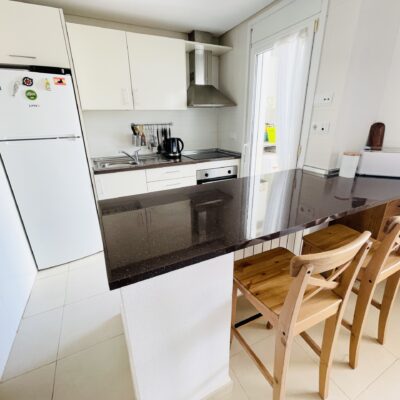 The property has a spacious living room with open plan kitchen which has been upgraded with modern cream gloss units and has a new kitchen island installed. There is a ground floor double bedroom with fitted wardrobes along with a ground floor bathroom and covered rear terrace. Upstairs there is a master bedroom, bathroom and sunny South-West facing sun terrace overlooking the golf course. Outside there is a driveway.