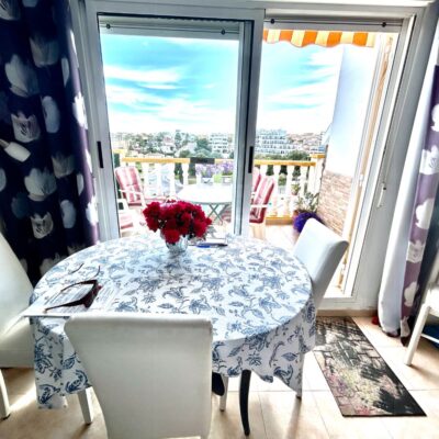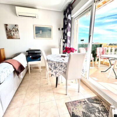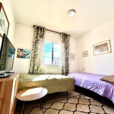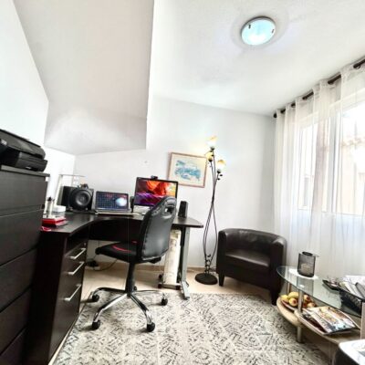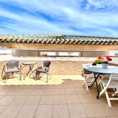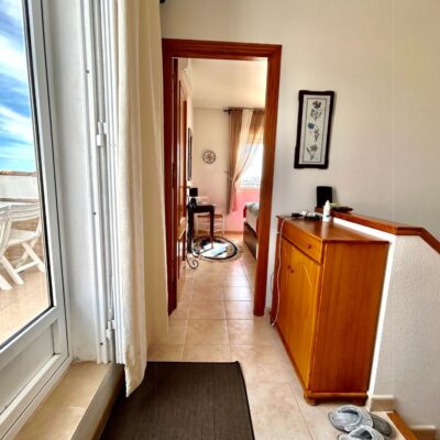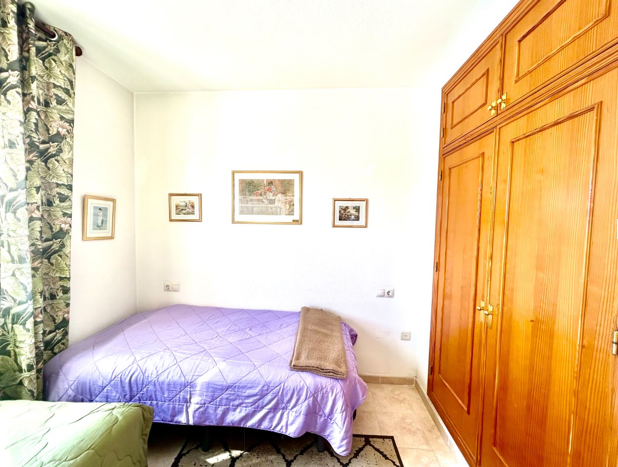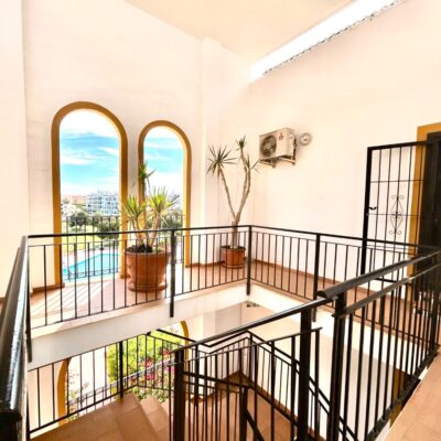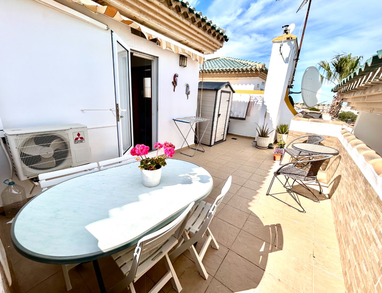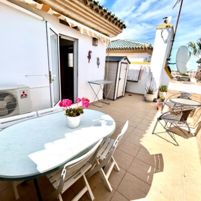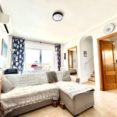 On entering this property you will find the lounge diner which has patio doors to a south facing terrace with pool views. There are two bedrooms and a bathroom on this floor with fitted wardrobes and also a separate kitchen. Upstairs is a further bedroom with fitted wardrobes and bathroom and its on this level you will find the spacious sun drenched solarium. We think this property offers great value for money. This development has a communal pool and tiled community area. The property is being sold furnished with aircon. Contact us to book a viewing appointment.