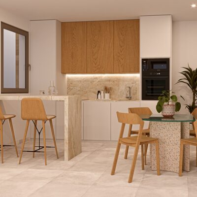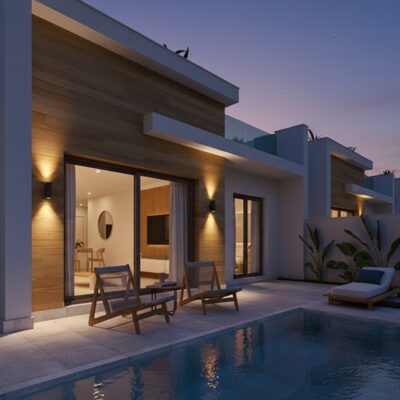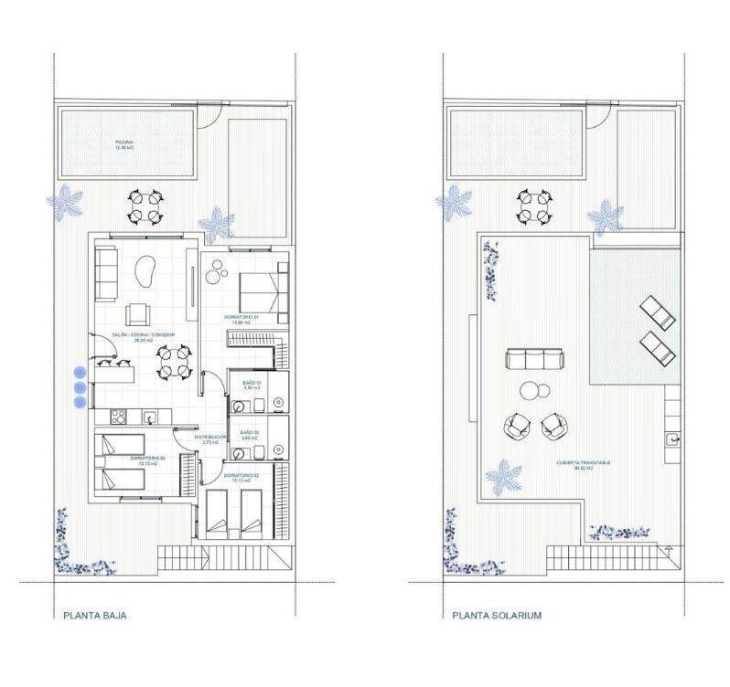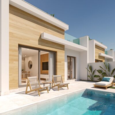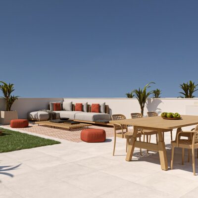 On entering these villas you will find a spacious open plan kitchen lounge diner with patio doors to the garden and the swimming pool, stairs from outside lead up to the roof solarium which has a summer kitchen and and enjoys the sunshine all year round. There are three double bedrooms with fitted wardrobes, a family bathroom and the master bedroom has its own ensuite and patio doors to the garden. They have pre installed ducted AC and come with white goods excluding the washing machine. The boiler is aerothermal, the double glazing has solar protection and they are thermally and acoustically insulated. Contact us to arrange to view these villas and others that suit your requisites.