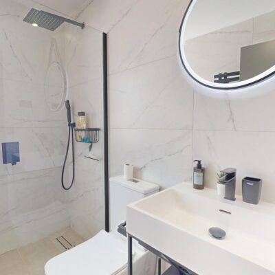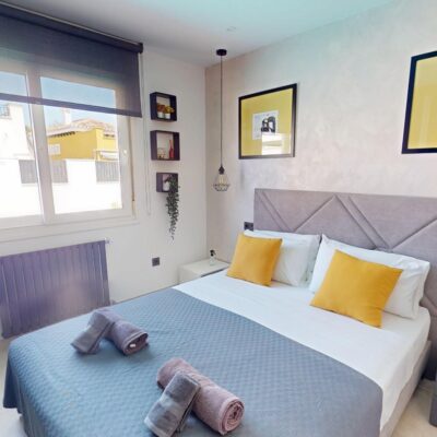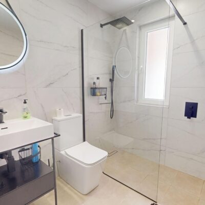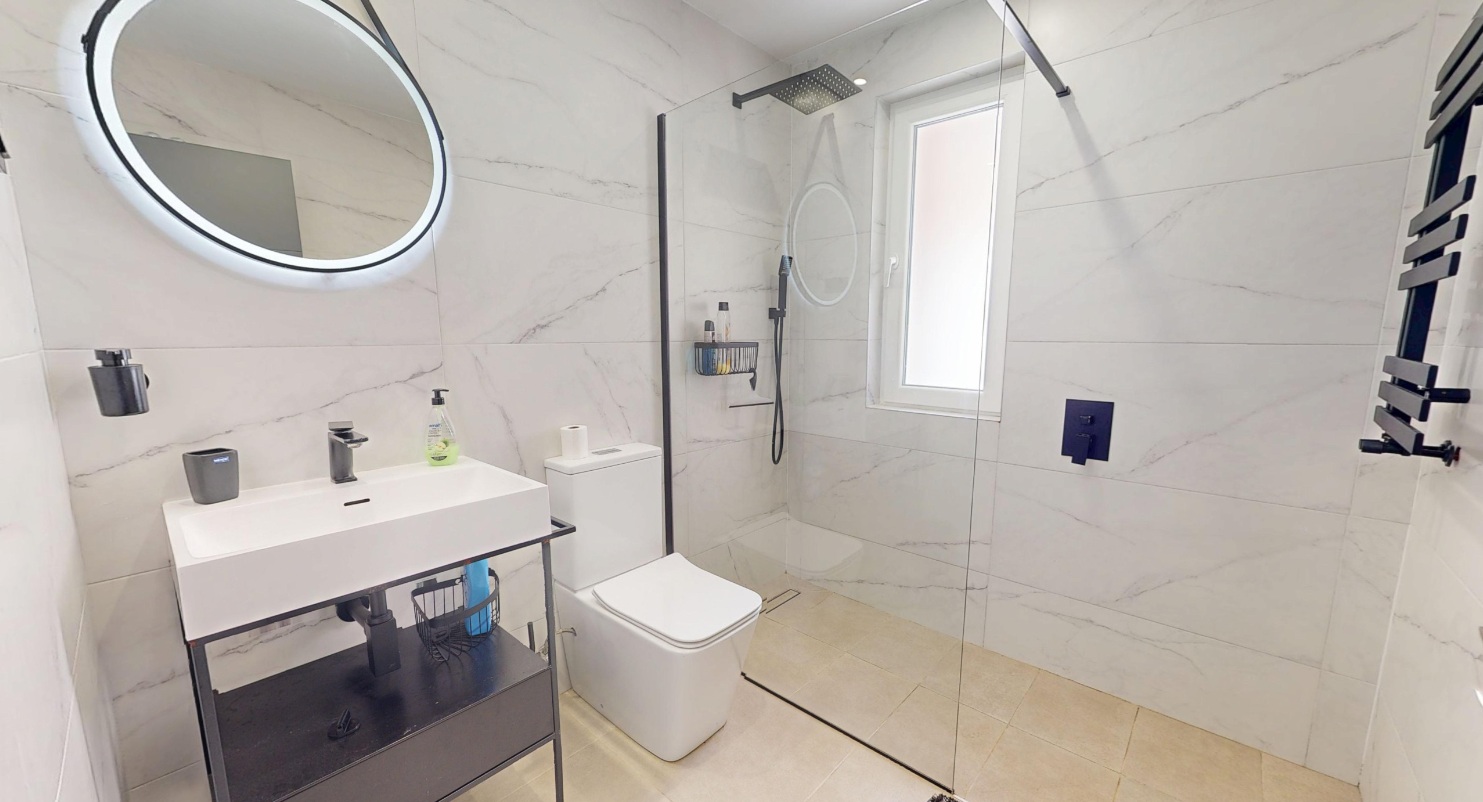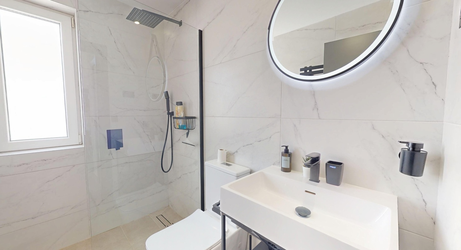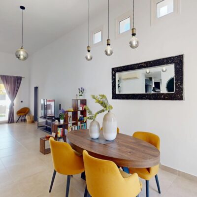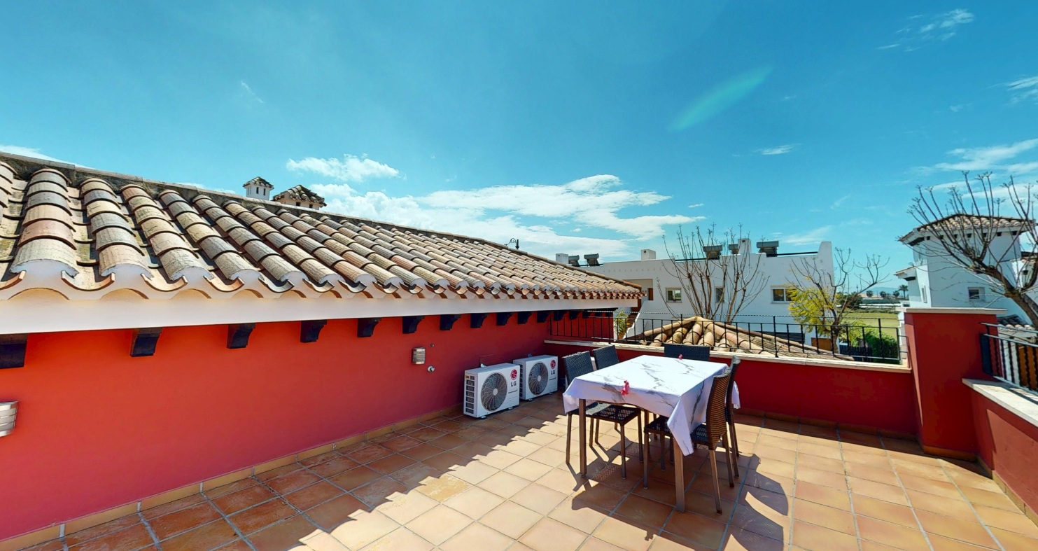 On entering the property you are immediately struck not only by the stylish decor and furnishings but by the space and light this style of villa gives you. The lounge is very spacious and has high ceilings with little windows. There are patio doors that lead to the garden which has its own private pool with a seating area. There is a covered terrace and ample space for sun loungers. Up external stairs and you will find the roof solarium.