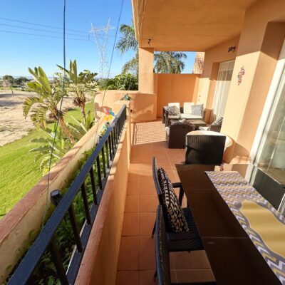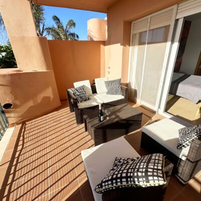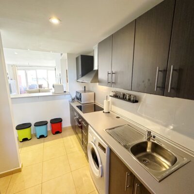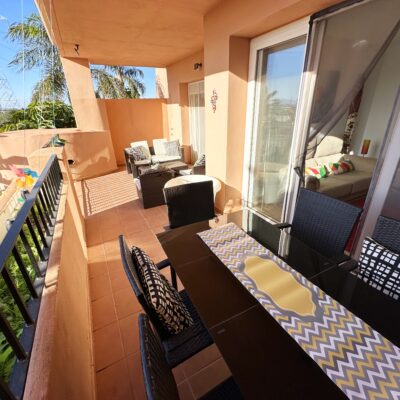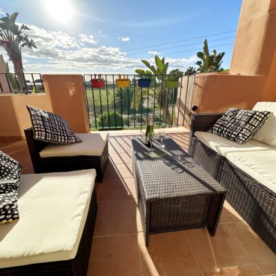 Entering the property into the spacious open plan living dining and kitchen area.  The kitchen is galley style with all mod cons and breakfast bar.  The lounge has patio door access onto the sunny terrace where you can enjoy frontline golf views.  There are two double bedrooms both with fitted wardrobes, the master has an ensuite and access to the main terrace.  The guest bedroom can enjoy its own private secluded terrace, perfect for a morning coffee.  There is also a separate guest shower room.  This property is in a great location on the resort.  Please contact us to book a viewing appointment.