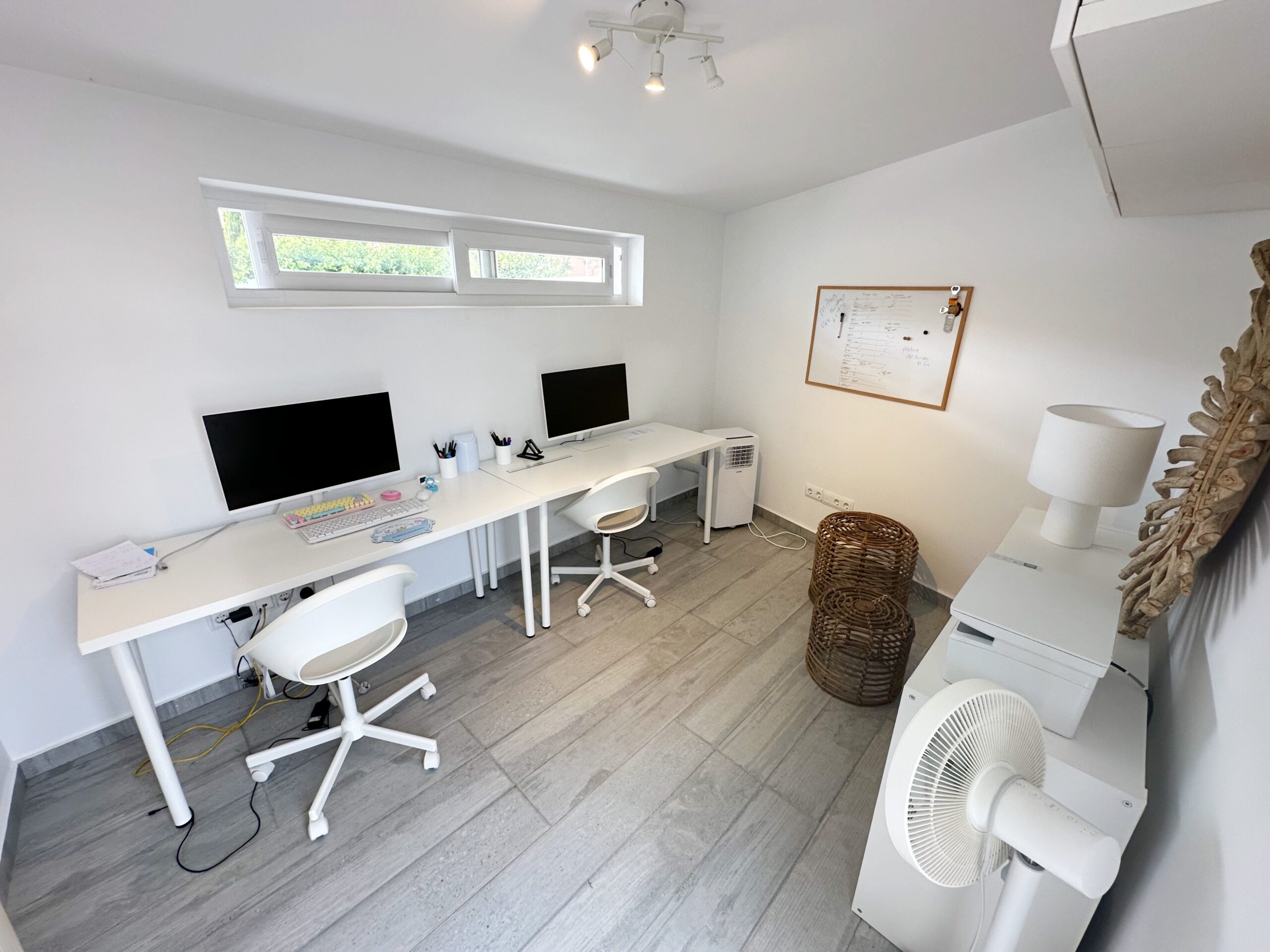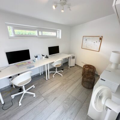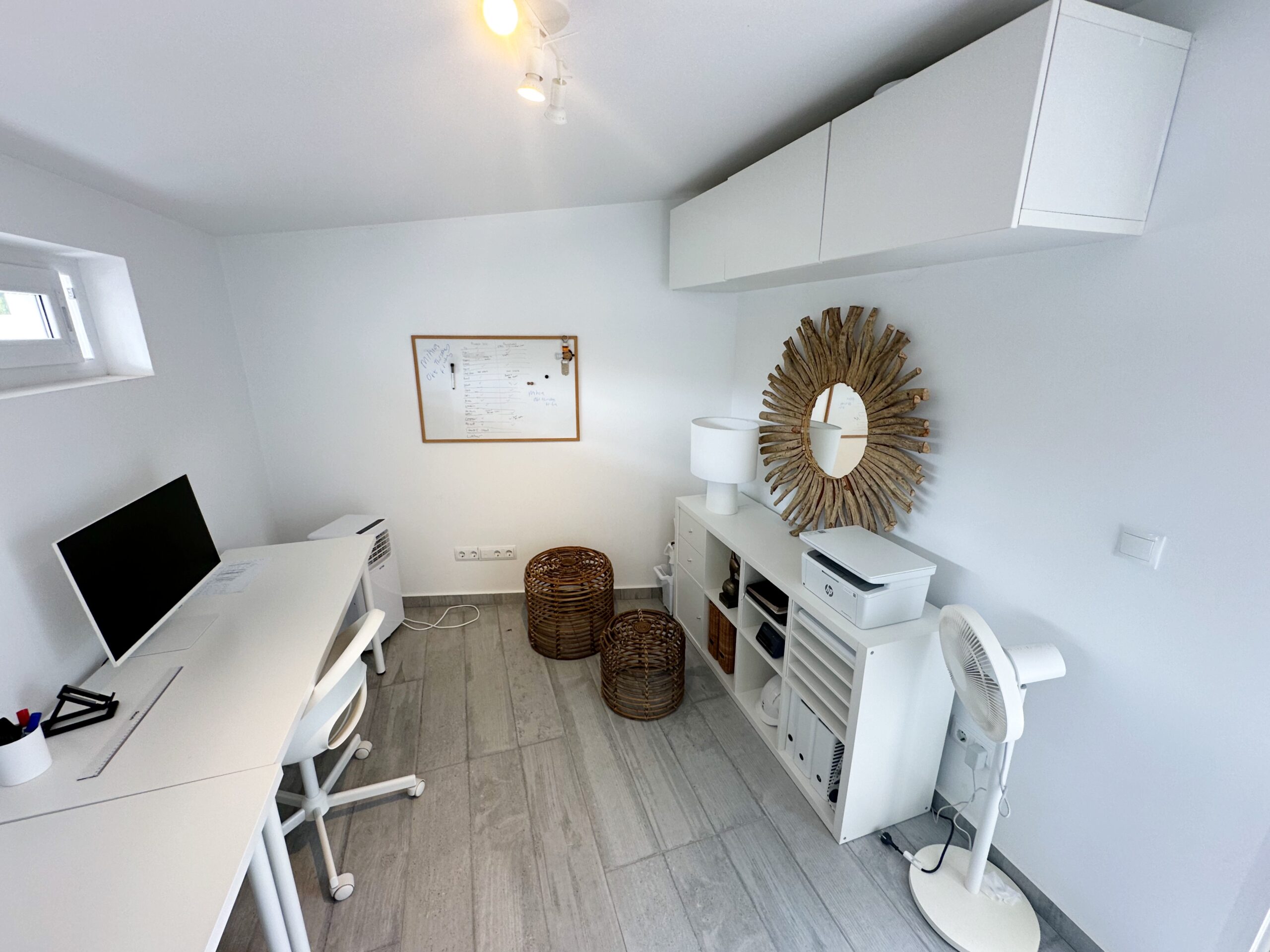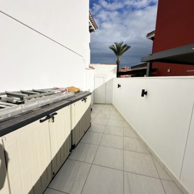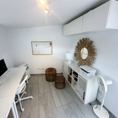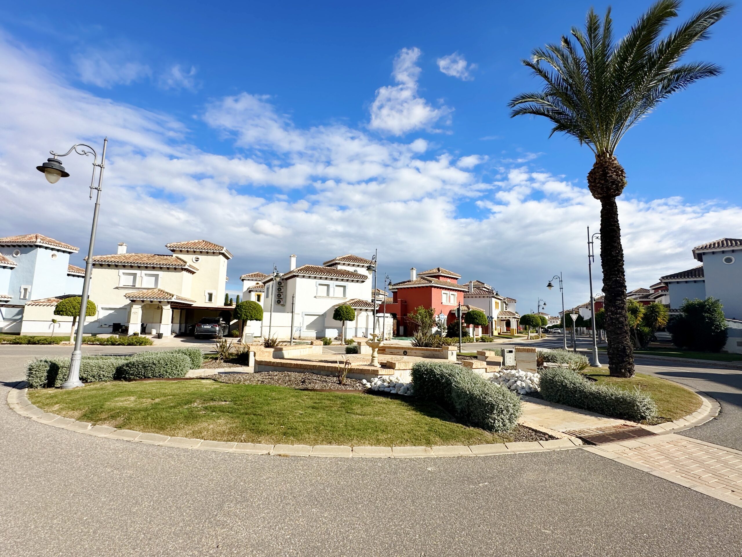 The villa has a lovely outlook to the front looking on to a fountained square. The owners have added an office with separate access to the right of the property. This could be used as an office or gym. You enter the villa into the newly tiled hallway with the stairs to the right and downstairs cloakroom. This leads into the gorgeous open plan kitchen diner. You’ll find a white gloss bespoke kitchen with built in appliances, central island with storage and seating and a fantastic open pantry. We have kitchen envy here! There is a spacious dining area – perfect for entertaining or family gatherings. Just off the kitchen diner is the spacious lounge with large L shape sofa. Bi-fold patio doors bring the outside in, flowing out to the covered pergola and al fresco dining area. The garden has been fully tiled with several storage cupboards either side of the villa. You’ll find a beautiful heated pool in a very private garden with plenty of room for sunbathing and entertaining. To the front is a driveway providing off road parking.