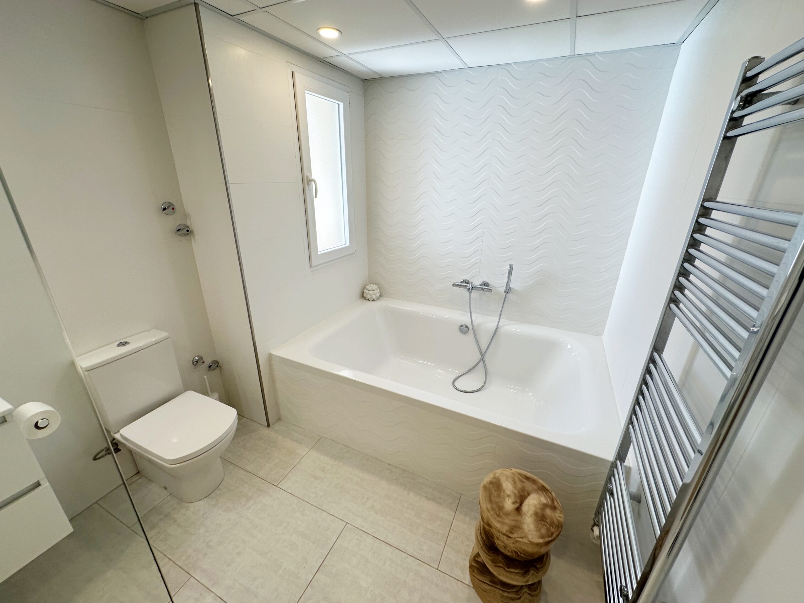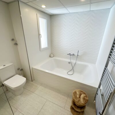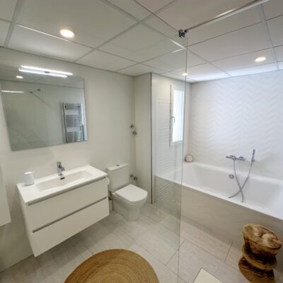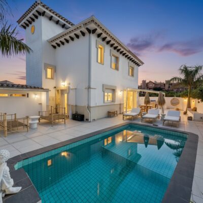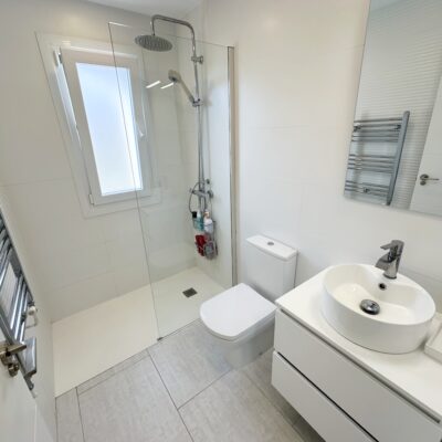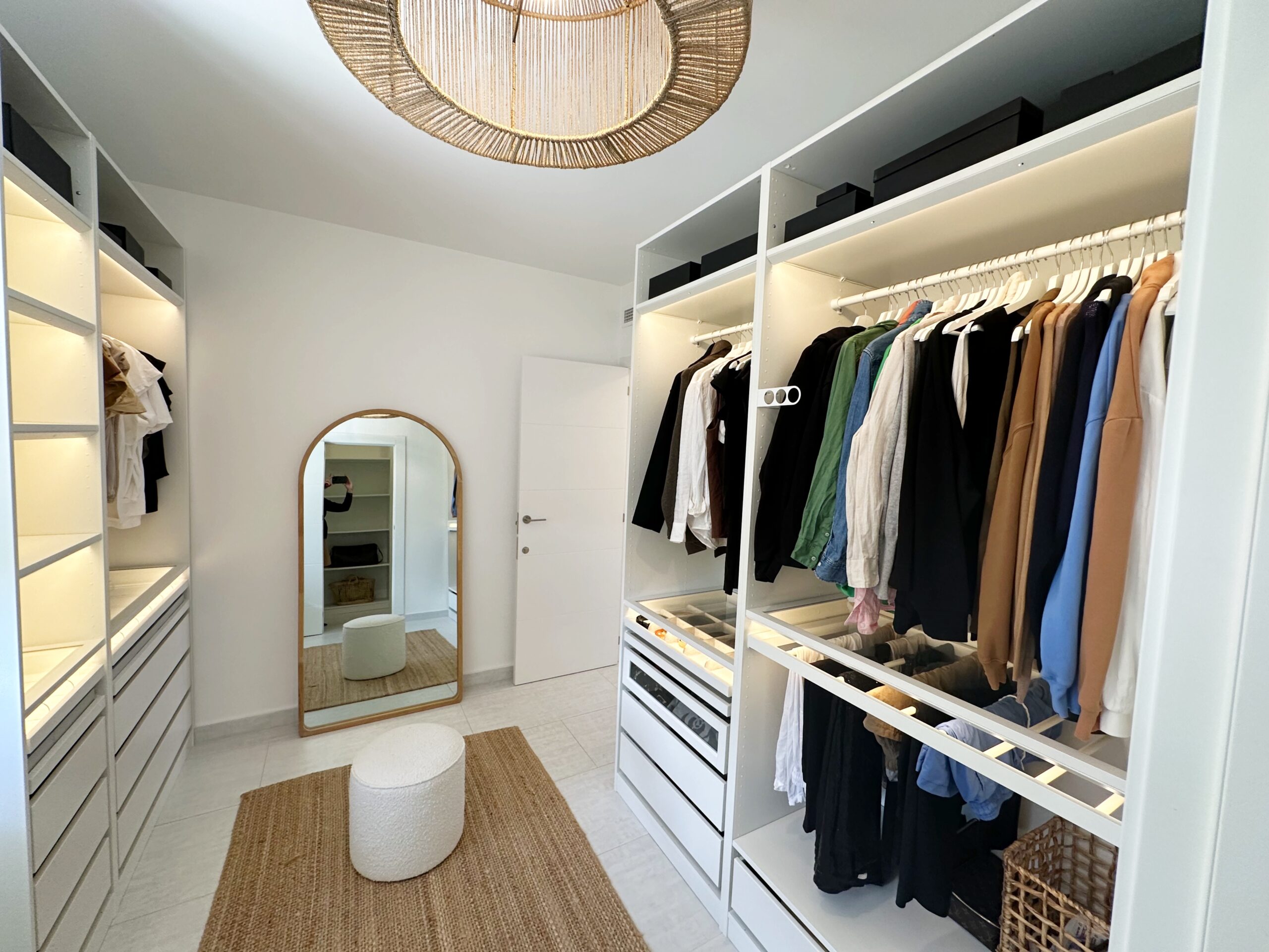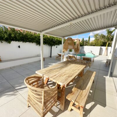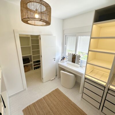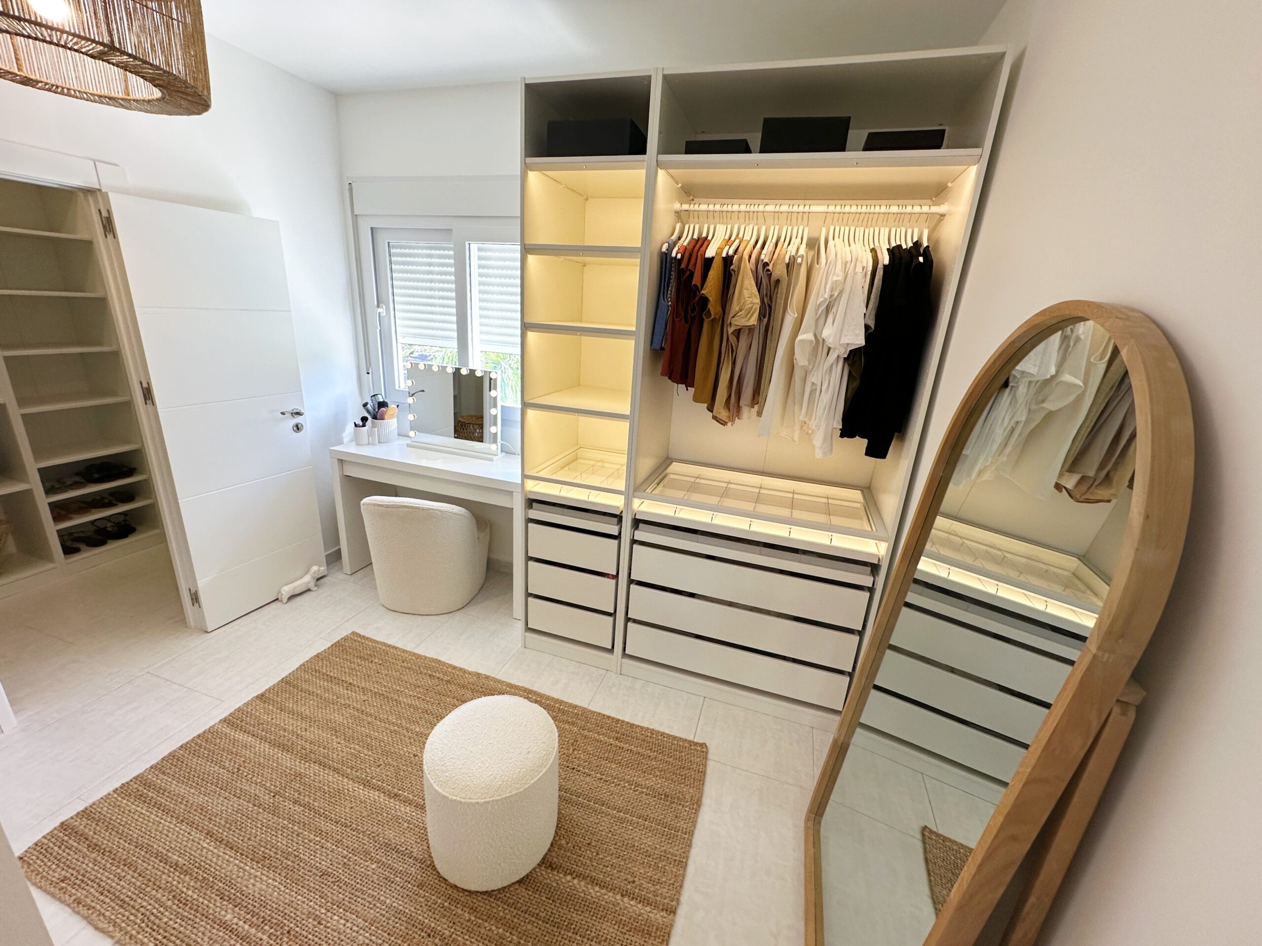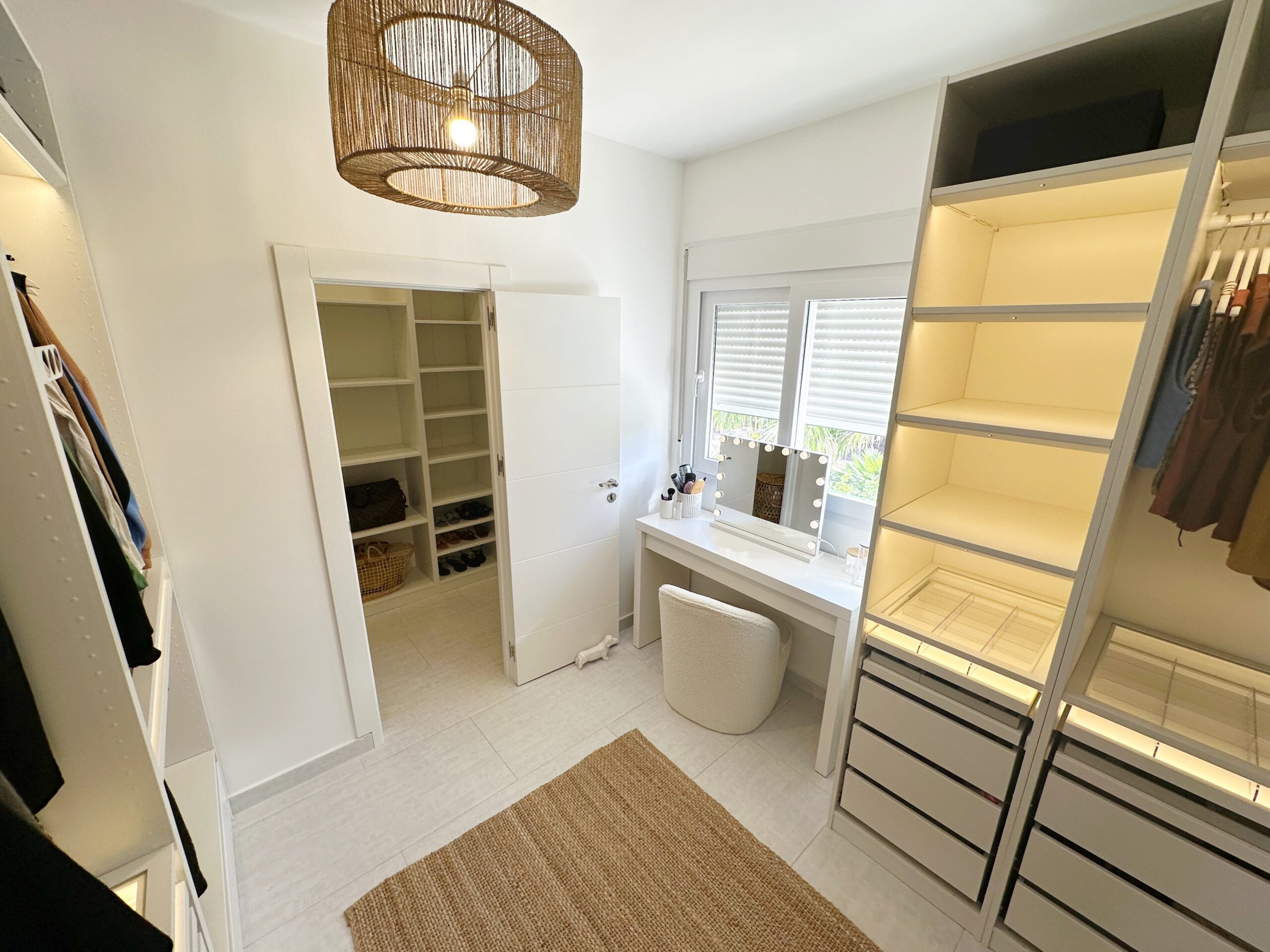 Upstairs there are four bedrooms. The master bedroom has wardrobes and a newly installed en-suite shower room. There are two double guest bedrooms and a huge family bathroom with walk-in shower and massive bath tub. The fourth bedroom is being used as a dressing room with a separate walk in wardrobe – a fantastic use of space. All the floors throughout have been replaced along with all bathrooms. This is a bespoke, fully modernised villa showcasing premium finishes, open-plan living, and a custom-built dressing room designed for both elegance and functionality. Please contact us now to book your viewing appointment, you will not be disappointed.