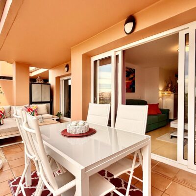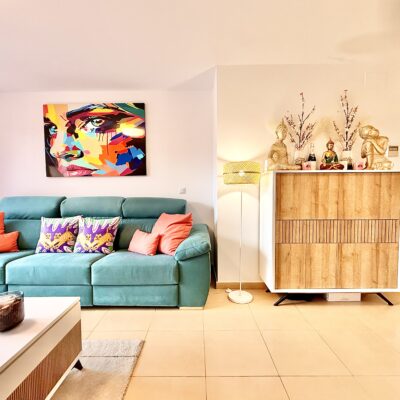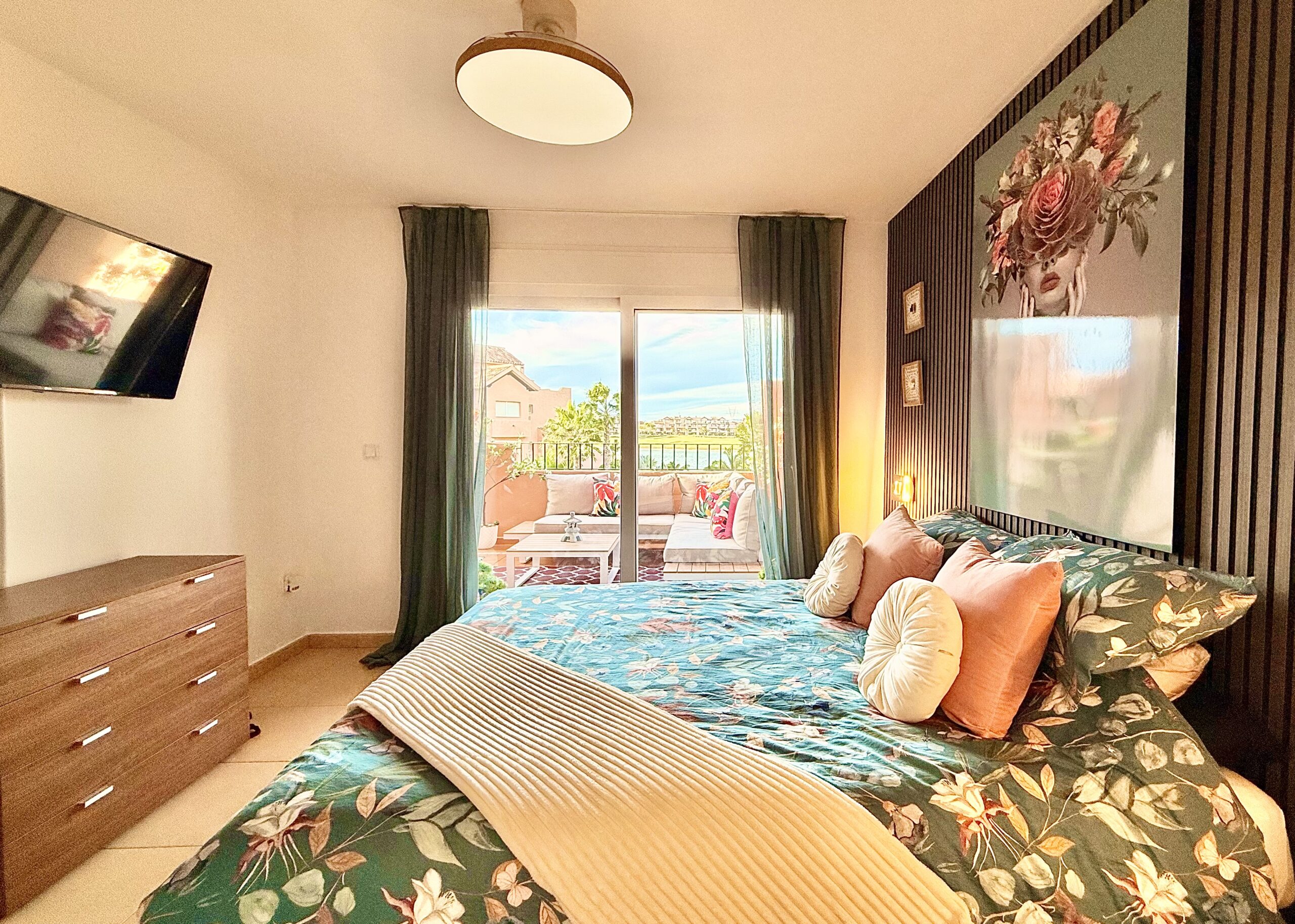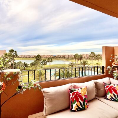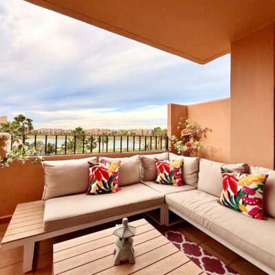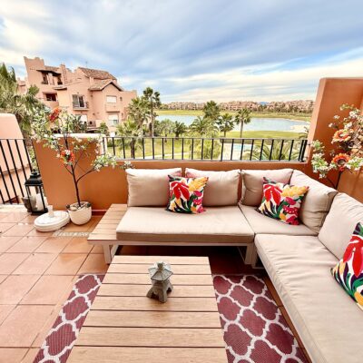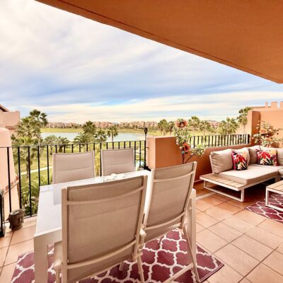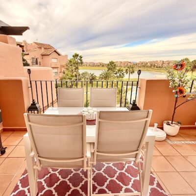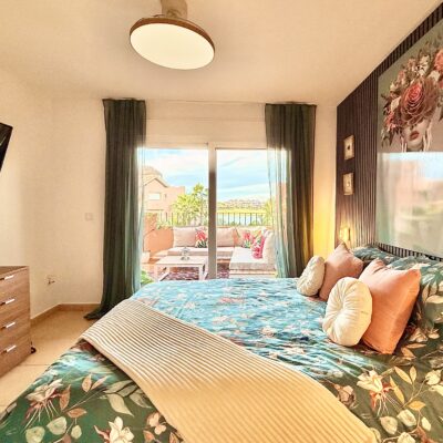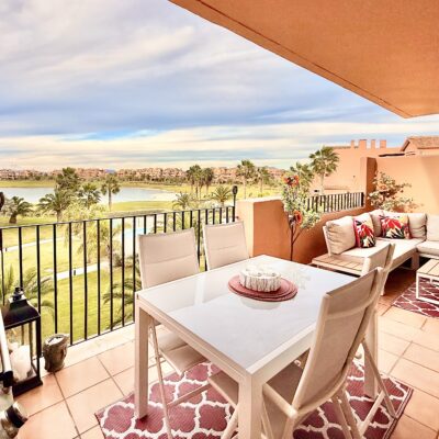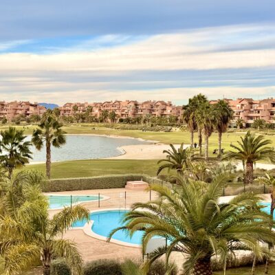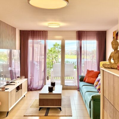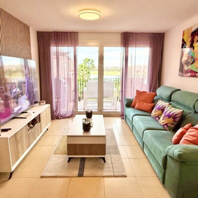 We are thrilled to offer this contemporary two bedroom two bathroom west facing apartment for sale on the Mar Menor Golf Resort.  The terrace enjoys wonderful views over one of the resorts communal pools and lake.  It is being sold furnished with recently installed hot and cold aircon and ceiling fans throughout. It comes with allocated underground parking with lift access to the second floor. The property is a short walk to the Ona Hotel and clubhouse.  There is an onsite supermarket, the MMGR club with padel, gym, mini golf and restaurant and just outside the resort the Boulevard with a variety of bars and restaurants. Murcia airport is a 20 minutes drive and Alicante an hour.