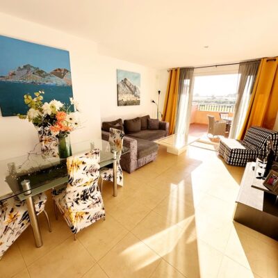 You enter the property into the open plan living space with the modern kitchen and breakfast bar and spacious lounge diner.  Patio doors lead to the spacious terrace where you can enjoy wonderful golf views.  There are two double bedrooms both with fitted wardrobes.  The master having an ensuite bathroom and direct access to the main terrace.  You will also find a separate family bathroom.  This is a great price in a fantastic location. Contact us now to book a viewing appointment.