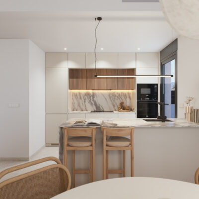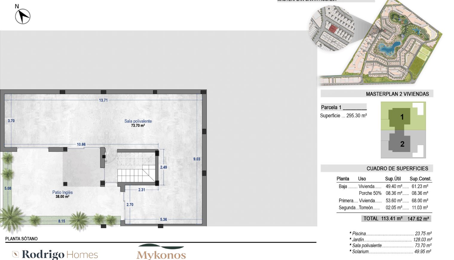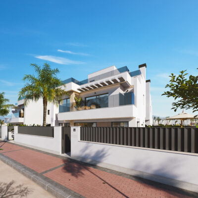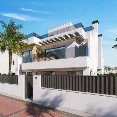 These villas sit on a 295m2 plot with video entry system, 30m2 parking area for your car, summer kitchen in the garden and a 24m2 pool with jacuzzi bench. On entering the property there is a large open plan kitchen diner lounge which is flooded with light from the three large patio doors that lead onto the garden, there is also a further door from the kitchen to the terraced area of the garden. The kitchen comes with Bosch white goods and there are spotlights throughout. On this level you will also find a good sized bedroom with fitted wardrobes, patio doors to the garden and a Jack and Jill bathroom. Upstairs are three further bedrooms with fitted wardrobes and ensuite bathrooms. The master bedroom has patio doors to the first floor terrace. Up internal stairs you access the roof solarium which has a WC and preinstalation for a Jacuzzi and kitchen should you wish to install them. The basement comes finished as a multizone area with preinstallation should you wish to put a bathroom down there, there is an english patio that brings natural light to this area.