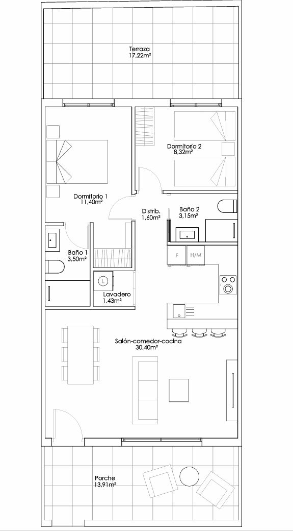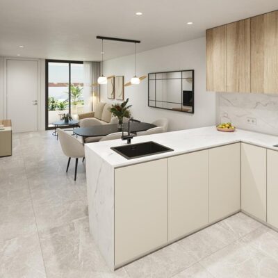 On entering this ground floor there is a 30m2 open plan kitchen with island and living dining area that has double glazed patio foors to the front terrace. There is a separate laundry room and the kitchen comes with white goods. The two double bedrooms have fitted wardrobes and patio doors to the rear terrace. The master bedroom has an ensuite and there is a further family bathroom and they both have underfloor heating. This gem of a property comes with some great extras like home automation system integrated to your smartphone, multizone vented AC with smartphone control, the double glazing is thermal with solar control and the kitchen and bathrooms have a ventilation system.