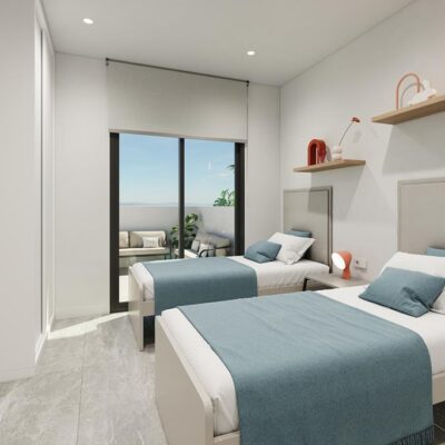 SPECIAL OFFER – 5000 euro furniture voucher included if you buy one of these two bedroom two bathroom ground floor apartments from us. Located in the bustling town of Pilar de la Horadada with all the amenities you could need and just a 11 minute bike ride to the beach, we really like these energy efficient apartments. There are 2 and 3 bedroom options available on ground floor or first floor penthouses with roof solariums. There is allocated parking with preinstalation for car charger, community pool with beach area, heated communal Jacuzzi, outside gym and bike storage with charger.
