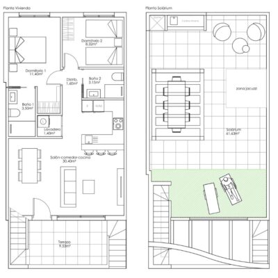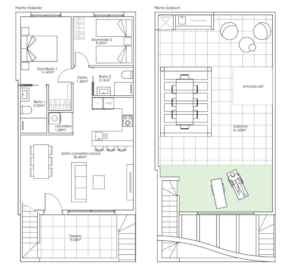 SPECIAL OFFER – 5000 euro furniture voucher included if you buy one of these two bedroom two bathroom penthouses from us. Located in the bustling town of Pilar de la Horadada with all the amenities you could need and just a 11 minute bike ride to the beach, we really like these energy efficient apartments. There are 2 and 3 bedroom options available on ground floor or first floor penthouses with roof solariums. There is allocated parking with preinstalation for car charger, community pool with beach area, heated communal Jacuzzi, outside gym and bike storage with charger.