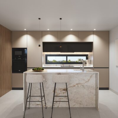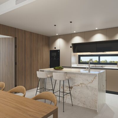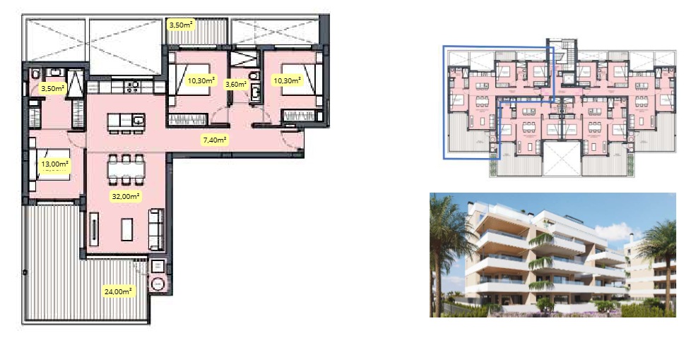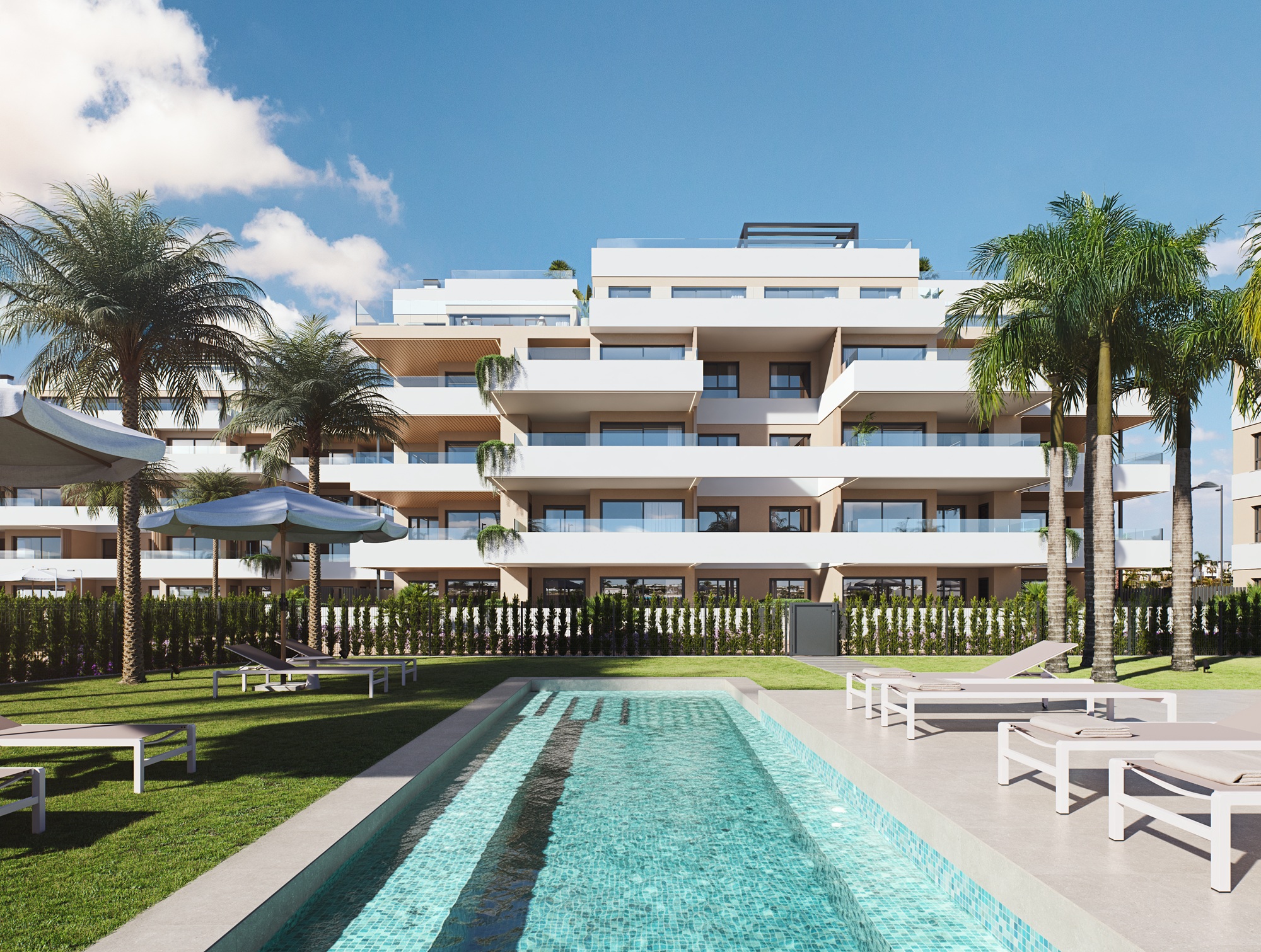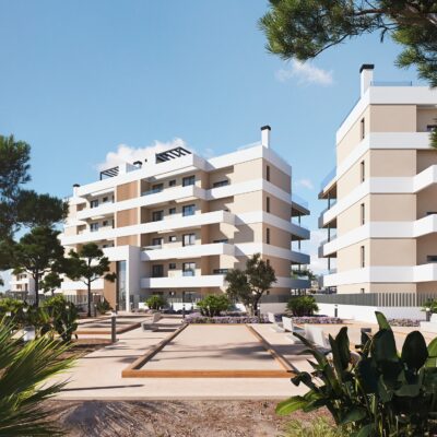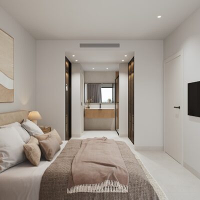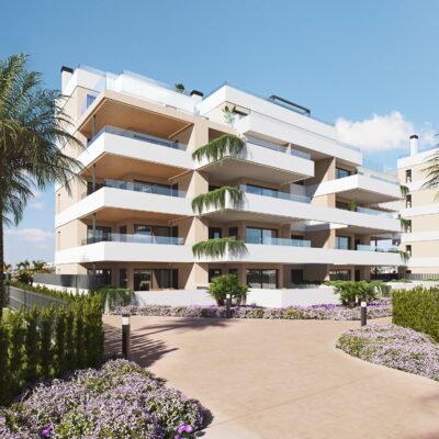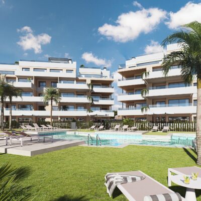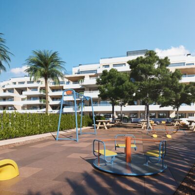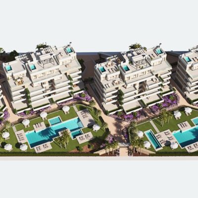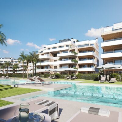 These apartments have two communal pools, one of which is heated. There is bicycle parking area and wash station, childrens play area and also a BBQ and picnic zone. On entering the property you will find a spacious open plan kitchen diner living room with patio doors to the terrace which is west facing. There are three double bedrooms with fitted wardrobes, a family bathroom and the master bedroom has its own ensuite bathroom and patio doors to the terrace. They come with vented hot and cold AC, underfloor heating in the bathrooms, aerothermal boiler, electric blinds in the bedrooms, underground parking and a store room.