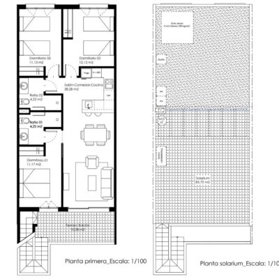 There is one flight of external stairs leading to a terrace from which you enter the property where you will find the open plan lounge kitchen diner with patio doors to the outside terrace. There are three double bedrooms with fitted wardrobes, a family bathroom and the master has an ensuite bathroom. From the terrace a second flight of stairs takes you to your private roof solarium. The penthouse apartments come with a parking space and a storeroom. This development has a communal pool and garden area