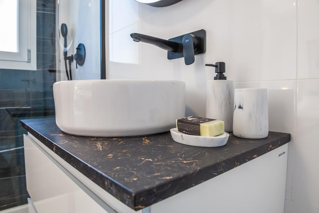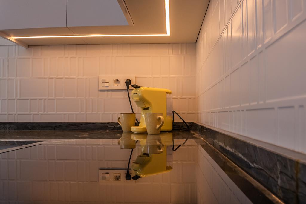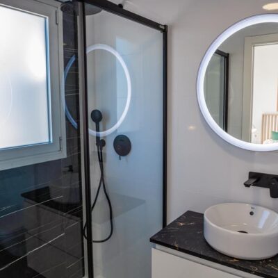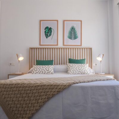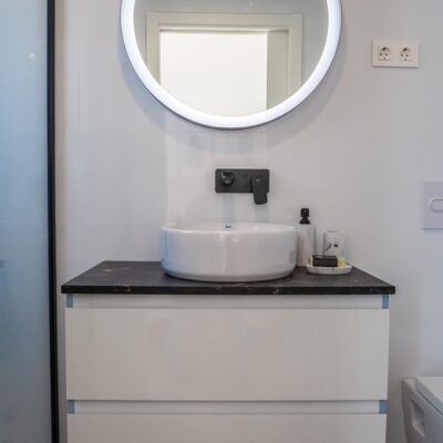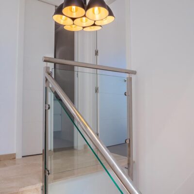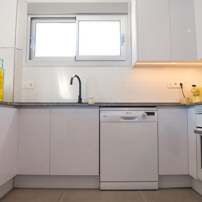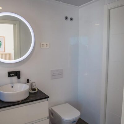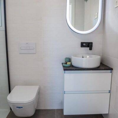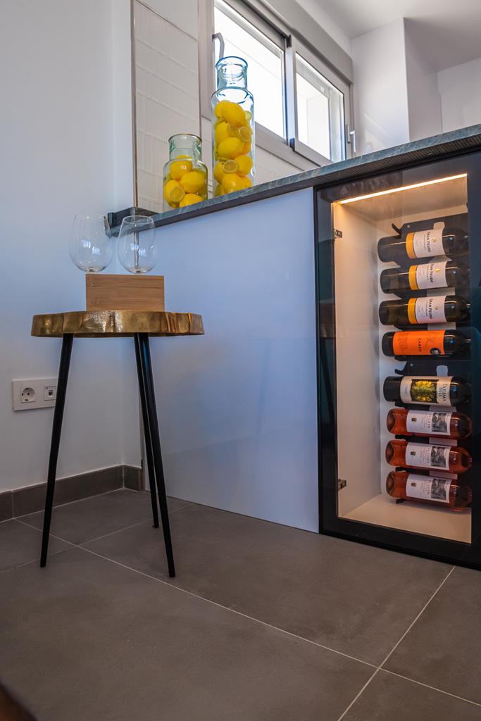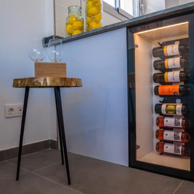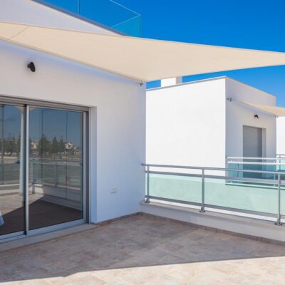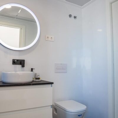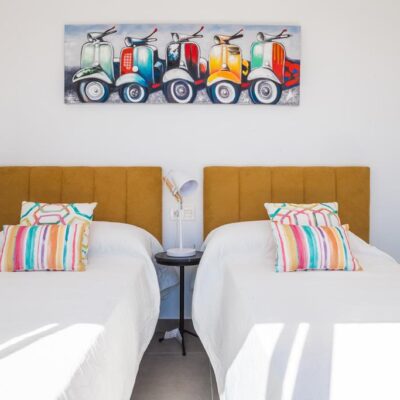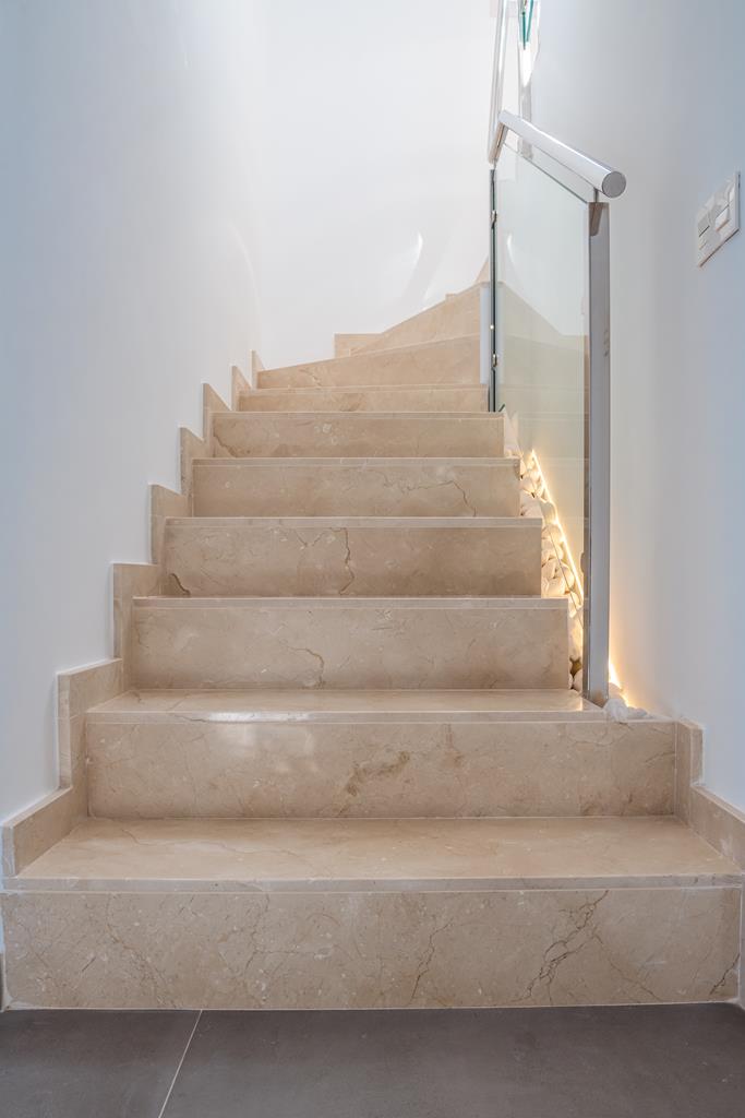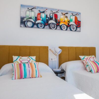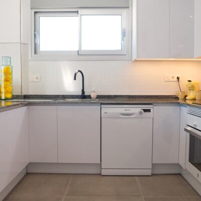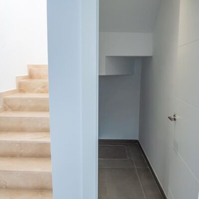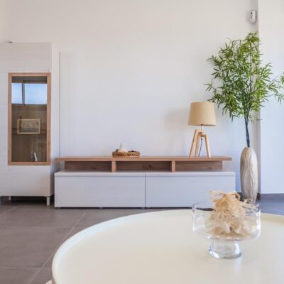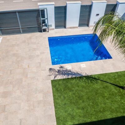 The villas have three bedrooms – one on the ground floor and two upstairs. There is an open plan living room with modern fitted kitchen, two bathrooms and two sun terraces. Outside there is a garden with private pool. There is also a garage – ideal for storage.