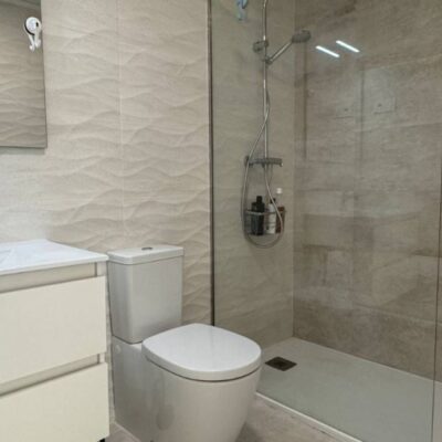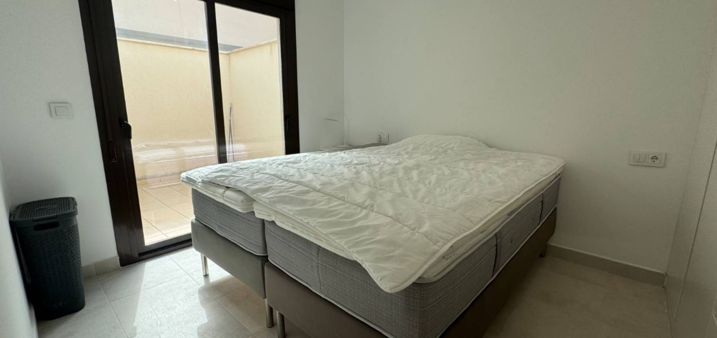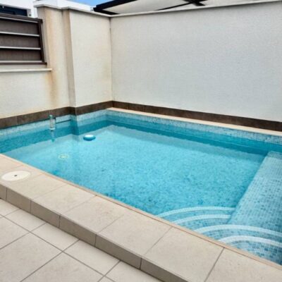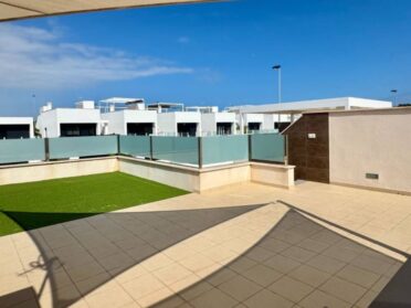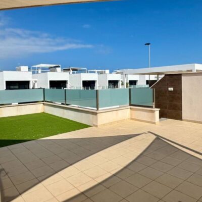 On entering the property there is a modern lounge diner with an L shape open plan kitchen, there are large patio doors with solar control glass that lead onto the terrace where you will find your own private pool and space for your car. Under the external stairs is handy storage area and on the roof you will find a large solarium which has a pergola, BBQ area, outside kitchen and another storeroom. In side there are 3 double bedrooms with fitted wardrobes, the front bedroom has patio doors to the garden and the rear two bedrooms have patio doors to a courtyard. The master bedroom has its own ensuite bathroom and there is a further family bathroom. Both bathrooms have underfloor heating. The property is sold furnished internally and externally and has Vented AC.