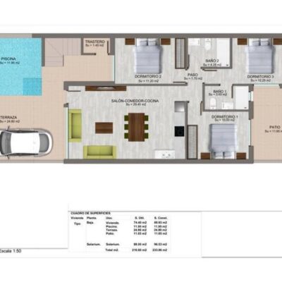 We are delighted to offer this single storey villa for sale with three bedrooms, two bathrooms and private pool, Located in San Pedro de Pinatar and just a 19 minute walk to the beach and some great restaurants like La Venezuela and Rubio 360. San Pedro has great public transport links too.