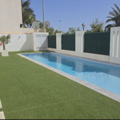 Up external stairs you reach the southwest facing terrace and through the front door you enter the lounge diner with open plan kitchen and island. Patio doors run of the lounge to the first floor terrace and from the kitchen there are patio doors to a utility area and stairs up to the 80m2 roof solariumd which has a pergola with awning and storage. There are two double bedrooms with fitted wardrobes, a family modern shower room and the master has its own ensuite bathroom. This gorgeous apartment comes with off road parking and store room, being sold furnished with vented AC and this small community has their own communal pool and garden area.