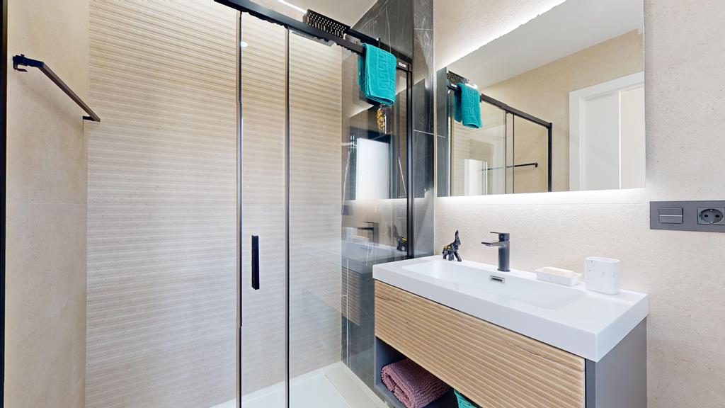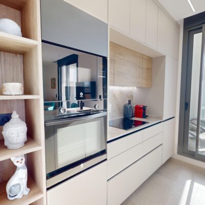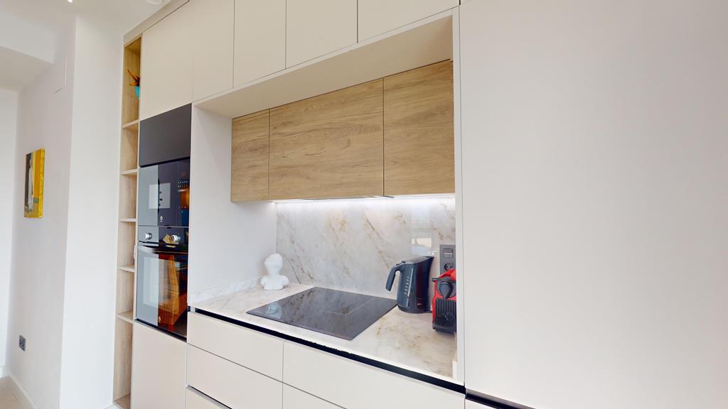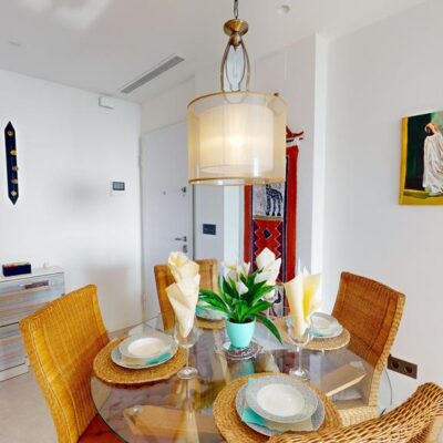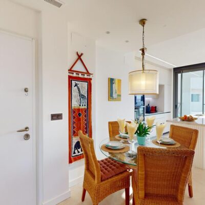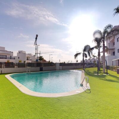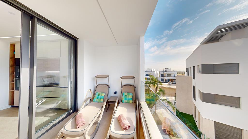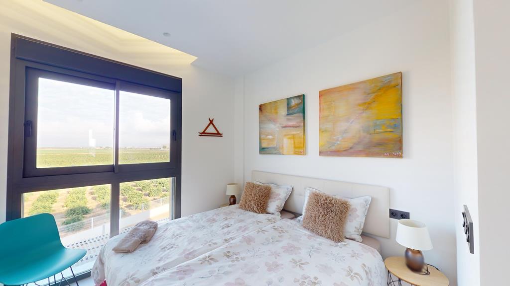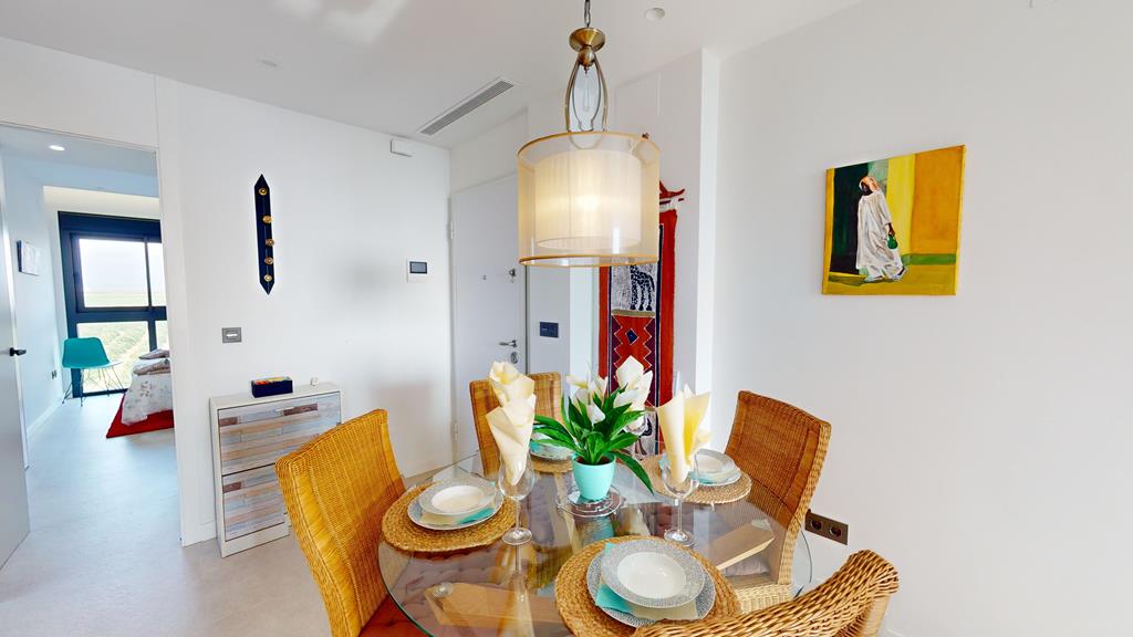No need to wait for your property to be built as this is a resale and comes furnished ( excluding the sideboard and patio furniture) with vented AC. On entering the property the lounge kitchen diner is to your left and comes with an island and patio doors to the south facing sunny terrace which has great views over the orange groves. There are two double bedrooms with fitted wardrobes. One bedroom has an ensuite and there is a further bathroom which could easily be made into an ensuite by adding a door in the hallway. There is a useful cupboard in the hall which houses the boiler and the washing machine. This apartment comes with covered parking and a storeroom and there is a community pool which is heated so can use all year round. The owner has all the permits in place for rental.
