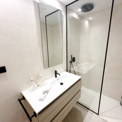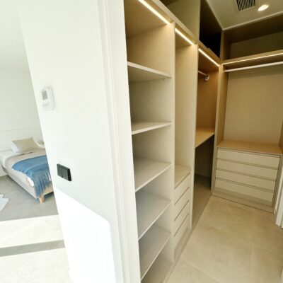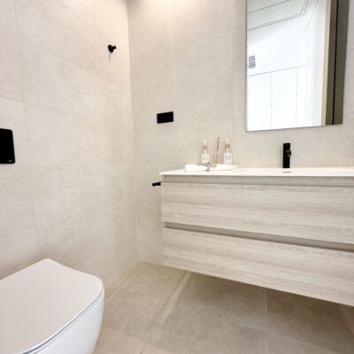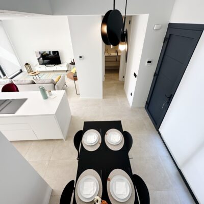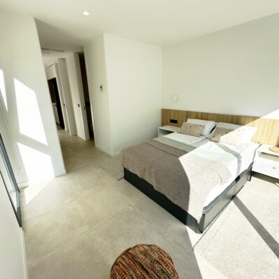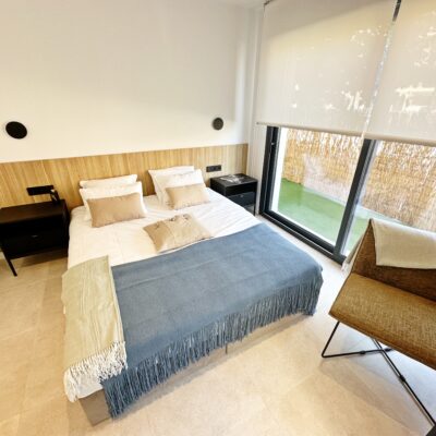 The interior has been carefully arranged with attention to material consistency and fine details. Wall-mounted lights in the bedrooms and the living-room pendant lamp were added at the owners’ request, reflecting a modern Spanish style with a subtly raw, stone-inspired character – resulting in a balanced and elegant atmosphere throughout.