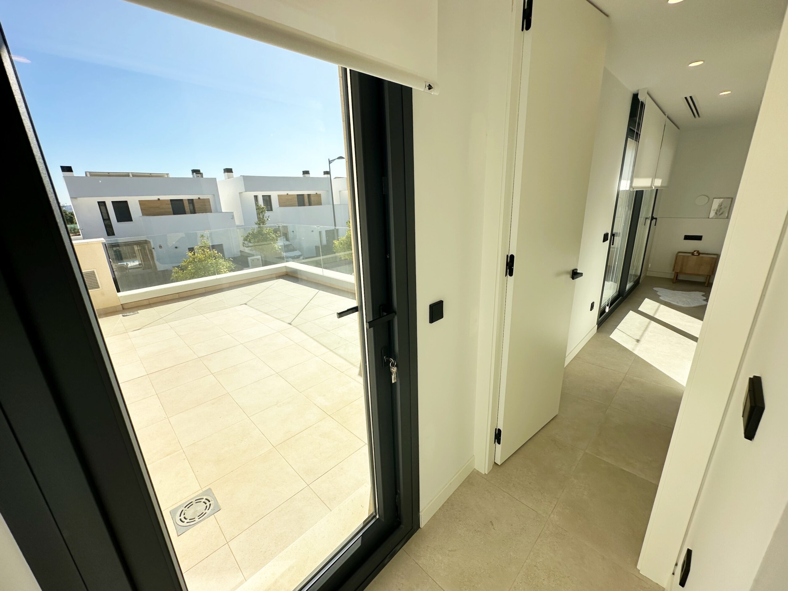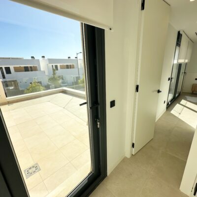 Upstairs, the master bedroom offers a walk-in wardrobe, an en-suite bathroom and its own private terrace. From this floor there is access to a spacious south-facing terrace, shared between the master suite and the hallway.