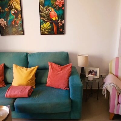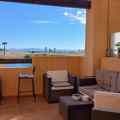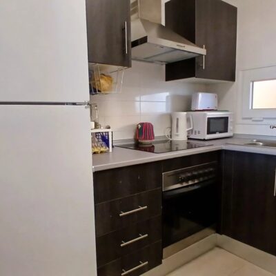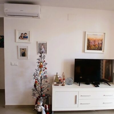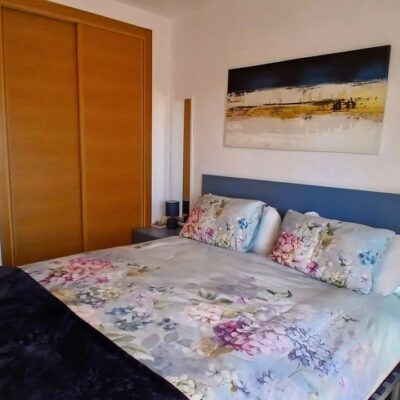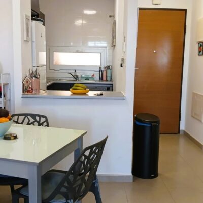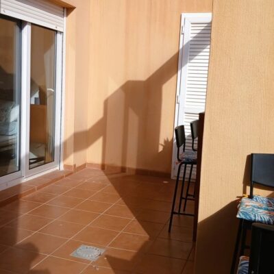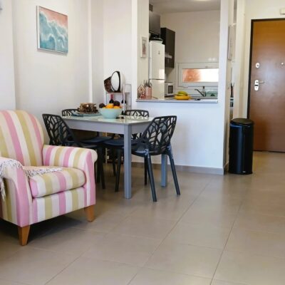 The apartment is being sold furnished and ready to move into, with air-conditioning in the living room and bedrooms. There are two bedrooms, a living room with doors opening to the terrace, fitted kitchen with appliances and a family bathroom.