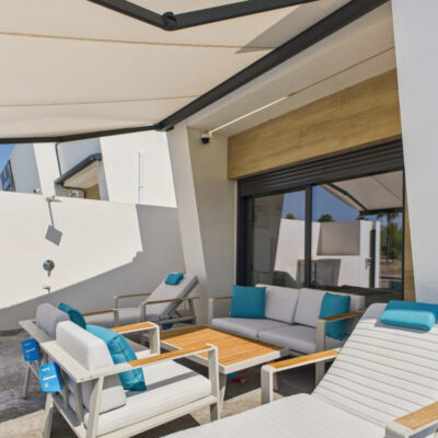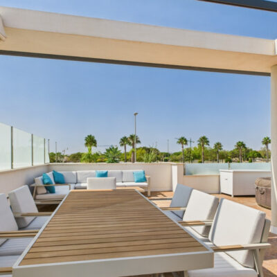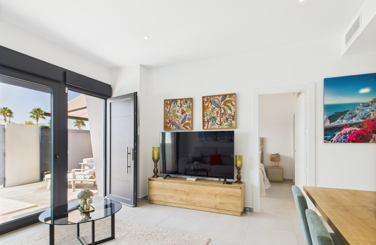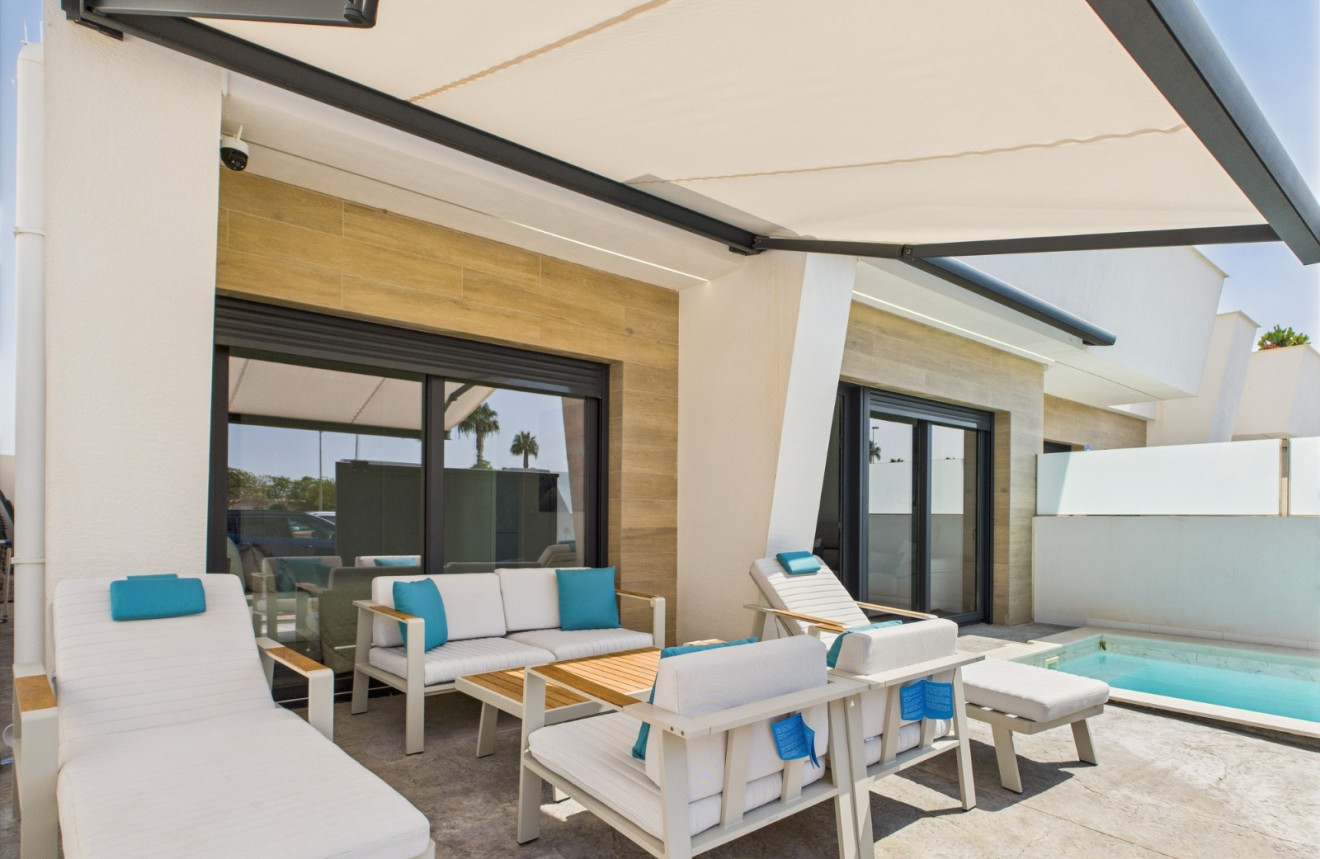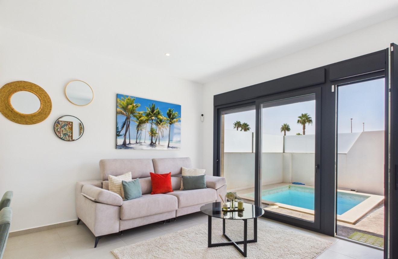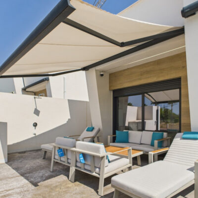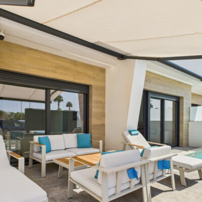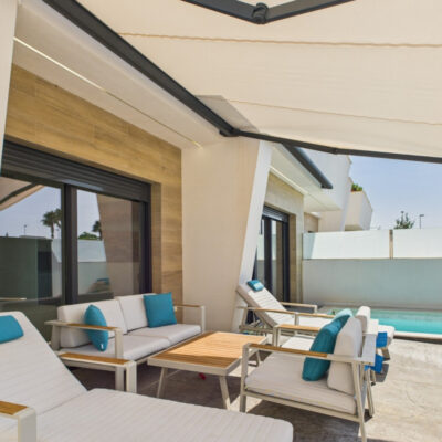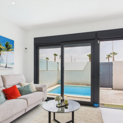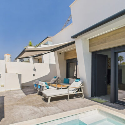 The villa offers three bedrooms, two bathrooms, an open-plan living room with sliding doors opening to the garden, modern kitchen with appliances included, a solarium with covered dining area and a separate WC. The villa is furnished to a high standard and the furniture is included in the sale. There is also hot and cold air conditioning throughout.