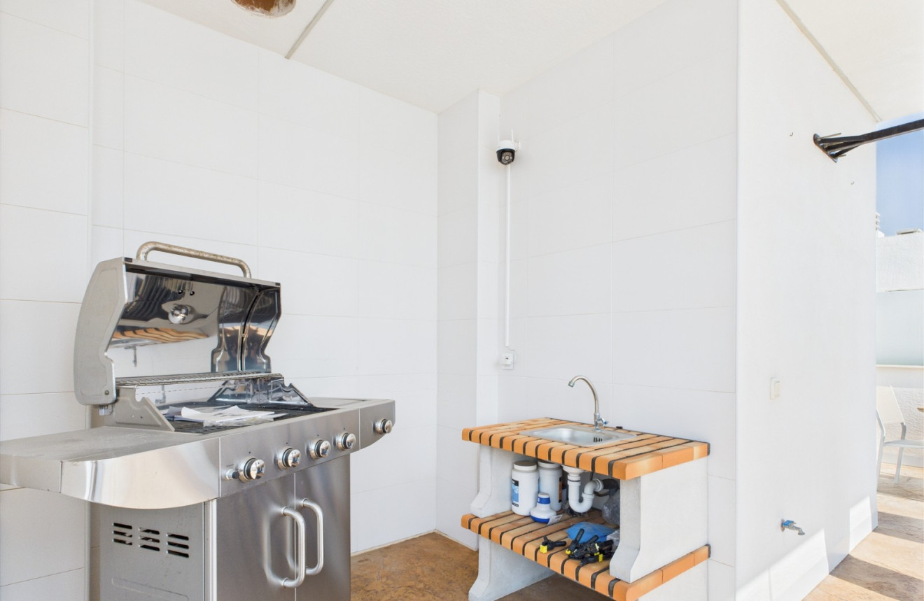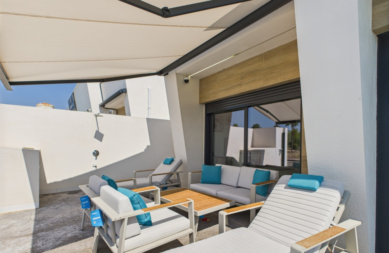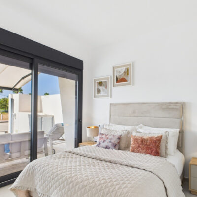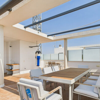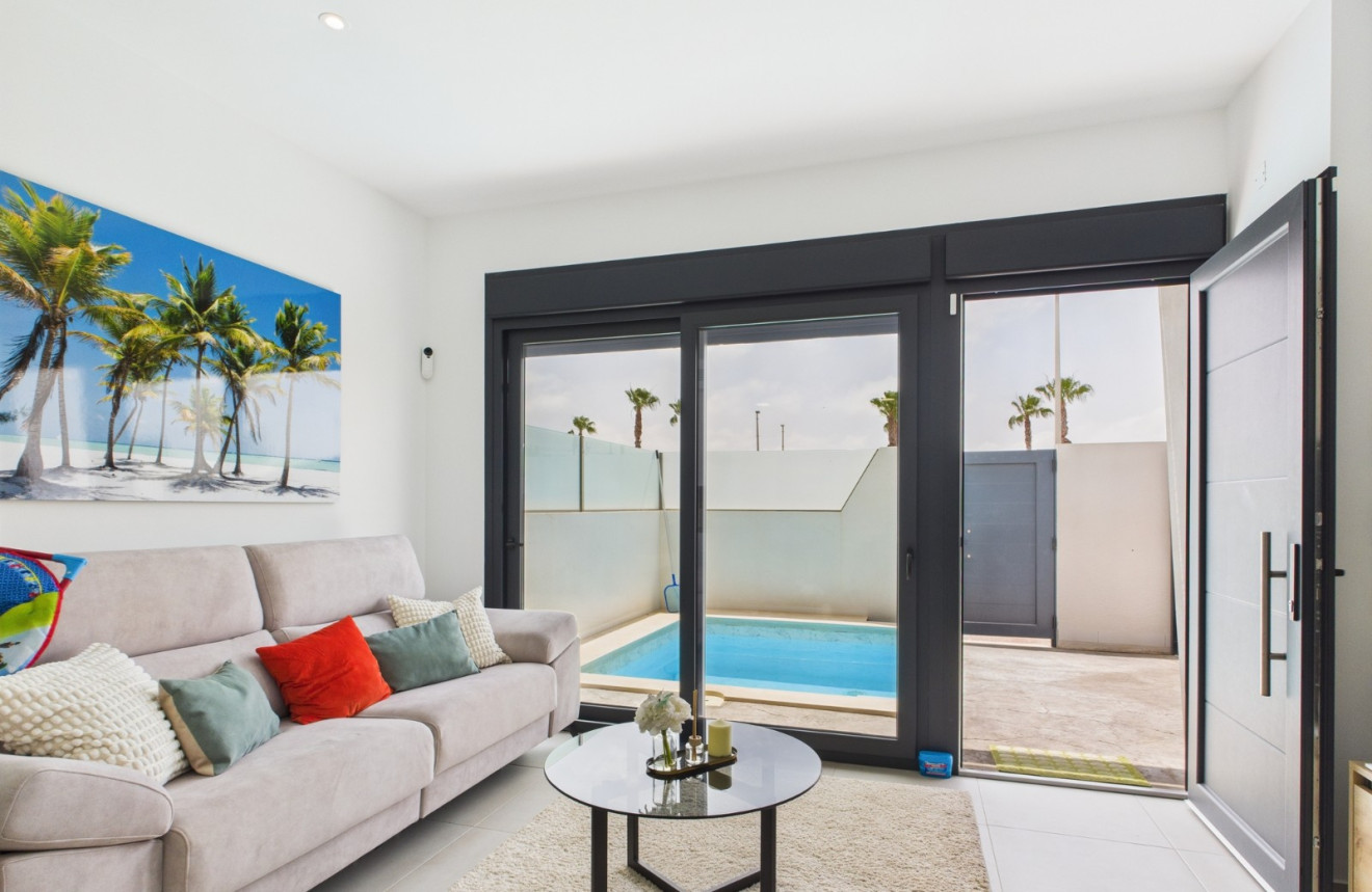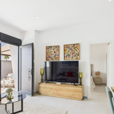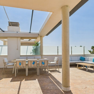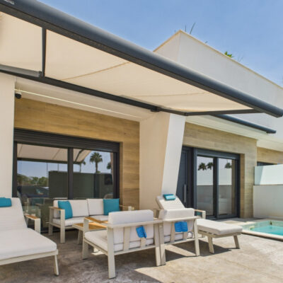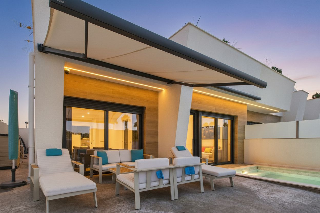 The villa offers three bedrooms, two bathrooms, an open-plan living room with sliding doors opening to the garden, modern kitchen with appliances included, a solarium with covered dining area and a separate WC. The villa is furnished to a high standard and the furniture is included in the sale. There is also hot and cold air conditioning throughout.