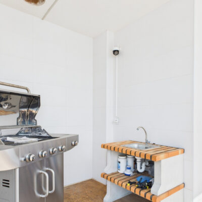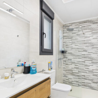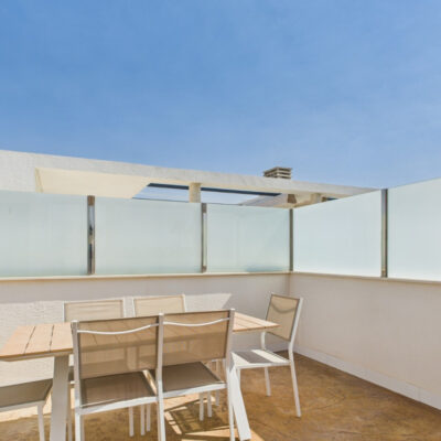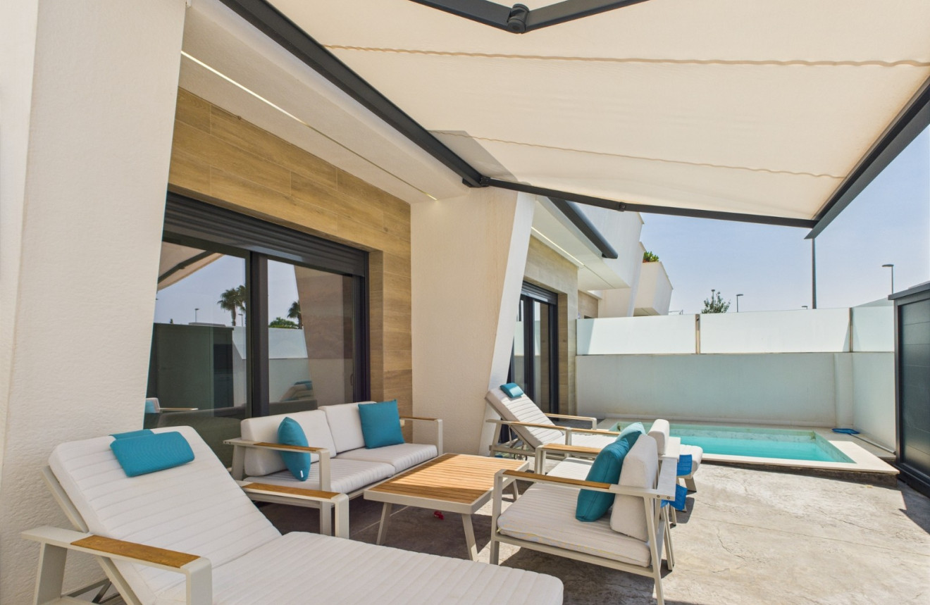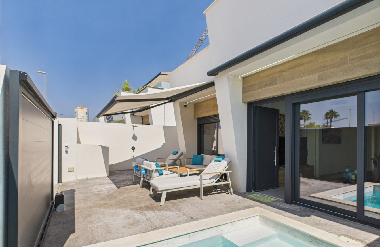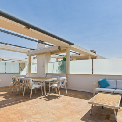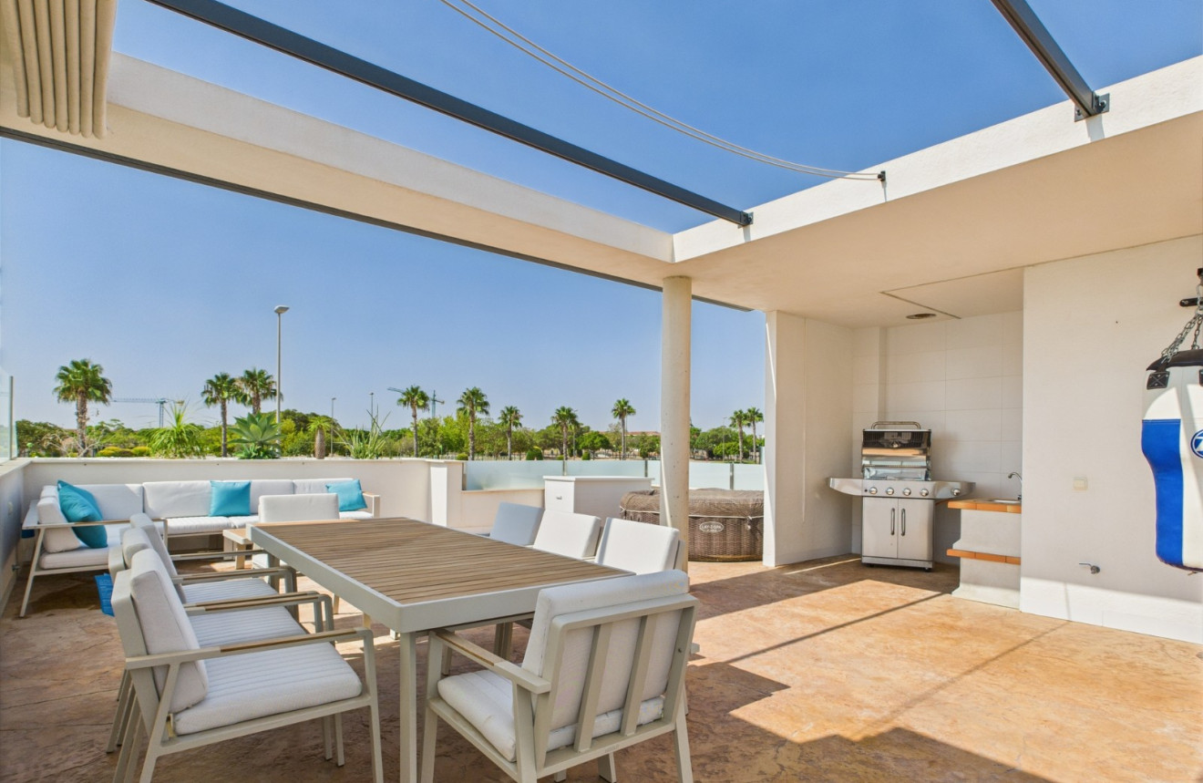 The villa offers three bedrooms, two bathrooms, an open-plan living room with sliding doors opening to the garden, modern kitchen with appliances included, a solarium with covered dining area and a separate WC. The villa is furnished to a high standard and the furniture is included in the sale. There is also hot and cold air conditioning throughout.