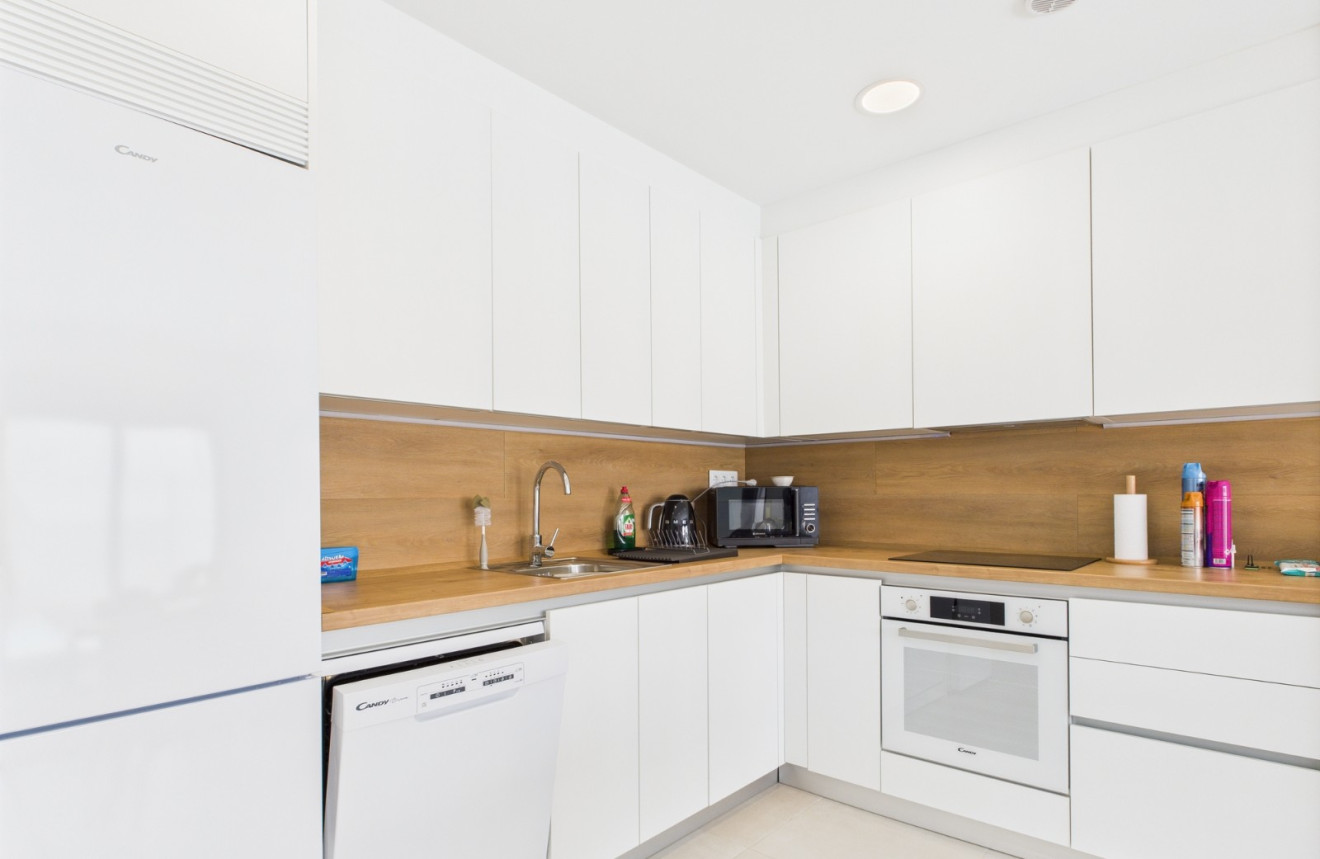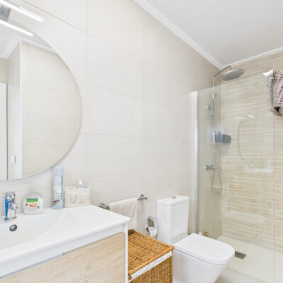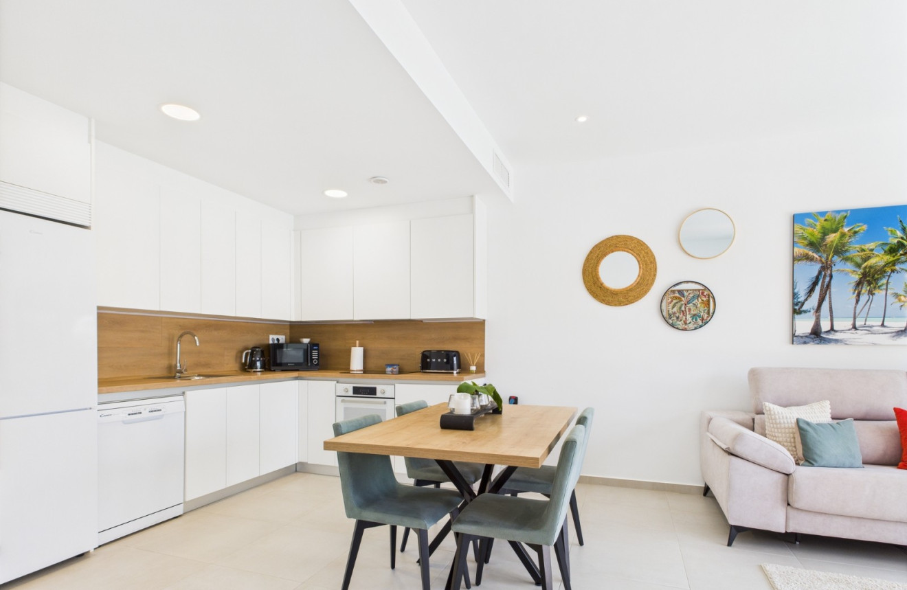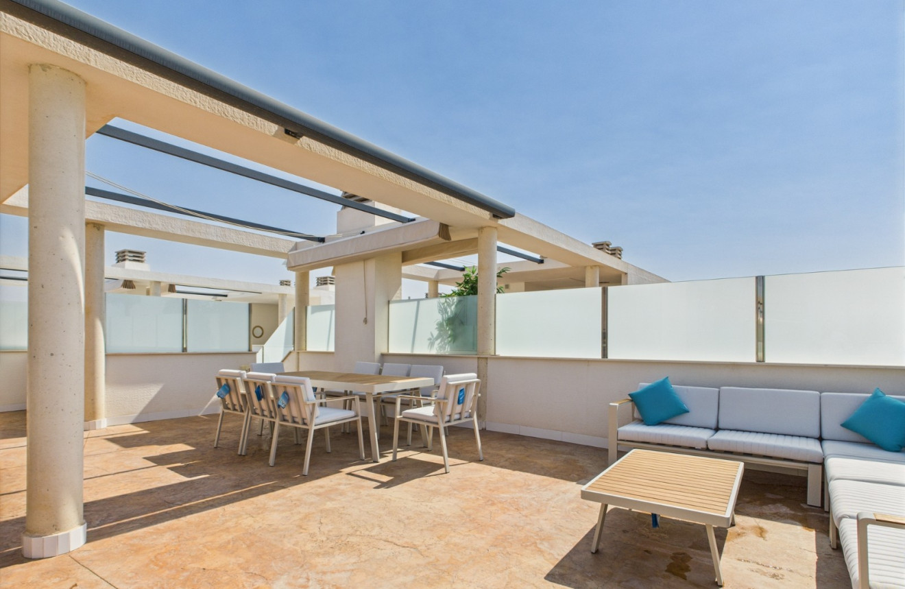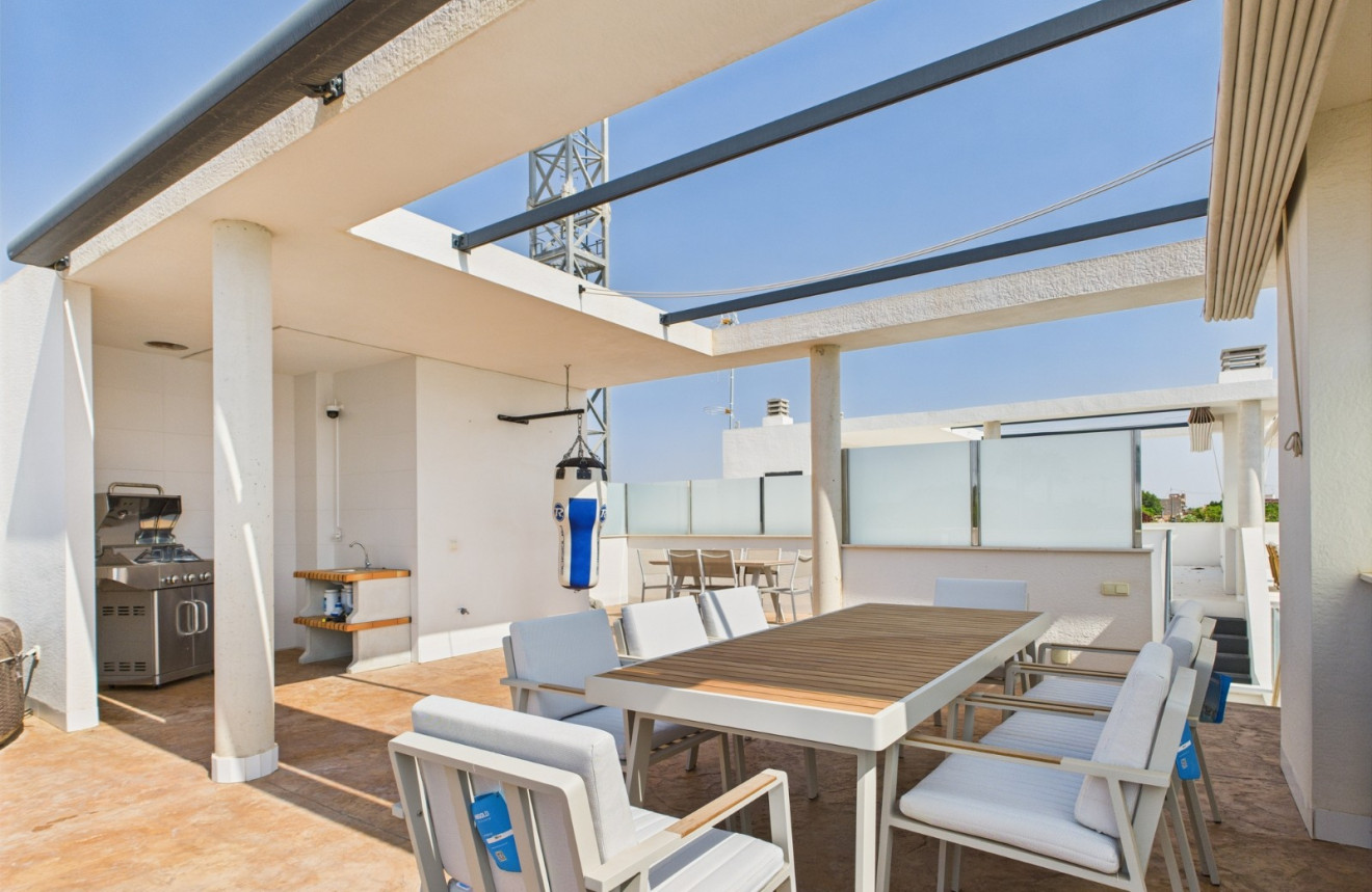The villa offers three bedrooms, two bathrooms, an open-plan living room with sliding doors opening to the garden, modern kitchen with appliances included, a solarium with covered dining area and a separate WC. The villa is furnished to a high standard and the furniture is included in the sale. There is also hot and cold air conditioning throughout.