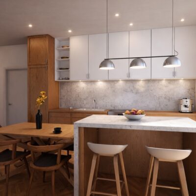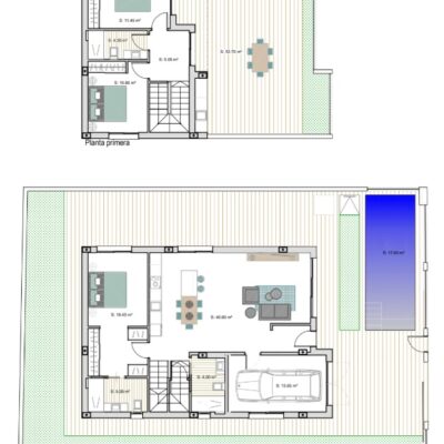 On entering the villa you will find a light and airy 41m2 lounge with open plan kitchen and island. There are large patio doors leading to the garden which comes with a 17m2 swimming pool. On the ground floor there is also a family bathroom and a generous master bedroom with walk in wardrobe and ensuite bathroom. This property also comes with its own garage which has a door to the lounge and this could be made into a further bedroom or office at a later date.
