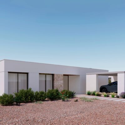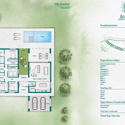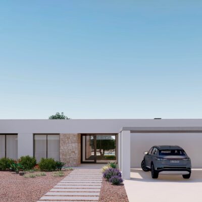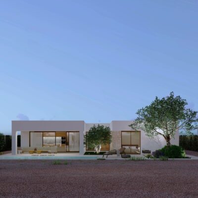 As you enter the front door there is an an entrance hall with a cloakroom off to the right. This property is in a U shape with the left wing for the bedrooms and the right wing for the living area and in the middle is a patio area which brings more light into the villa. The lounge dining area is 55m2 with an open plan kitchen which comes with white goods and has an island. There is also a separate laundry room with washer dryer included. There are large patio doors to the garden which has a 4×9 m2 swimming pool and comes landscaped with native plants and fruit trees. There are three double bedrooms with fitted wardrobes, two family bathrooms and the master bedroom has a walk in wardrobe and ensuite bathroom. All the rooms have patio doors to the garden. These properties come with vented ac, aerothermal system for hot water, internal and external LEDS, osmosis system for water in the kitchen and preinstalation for electric car charger. There is also a 30m2 garage.